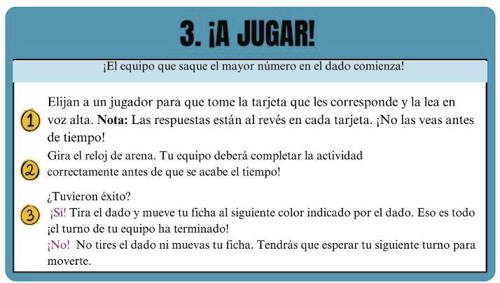 Durante el juego, es necesario ayudar a los estudiantes a comprender mejor las situaciones presentadas en las tarjetas haciendo preguntas como: “¿Cómo crees que esto afecta al medio ambiente?” y “¿Cómo crees que afectaría a tu dinero?” También puede preguntarles: “¿Te parece que esta situación te recuerda algo que has visto antes?”. Al finalizarel juego, es necesario pregun-