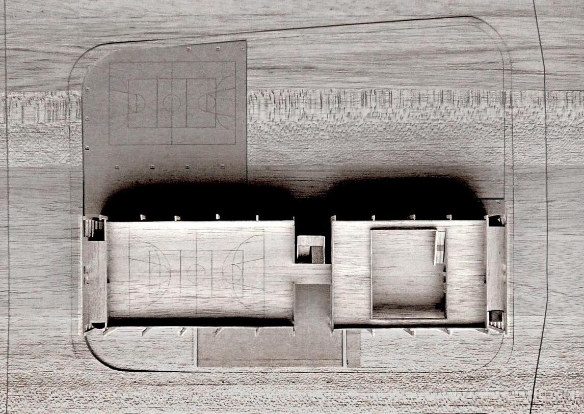 A quadra esportiva dos estudantes menores fica no térreo ao ar livre. A escola dos alunos mais velhos tem sua área de recreação e esportes em cima das salas de aula do colégio adjacente. Portanto, uma instituição de ensino encaixa-se na outra, formando um todo arquitetonicamente único. O resultado é um volume de maior porte e mais vertical do que o entorno, constituído por moradias humildes e térreas.