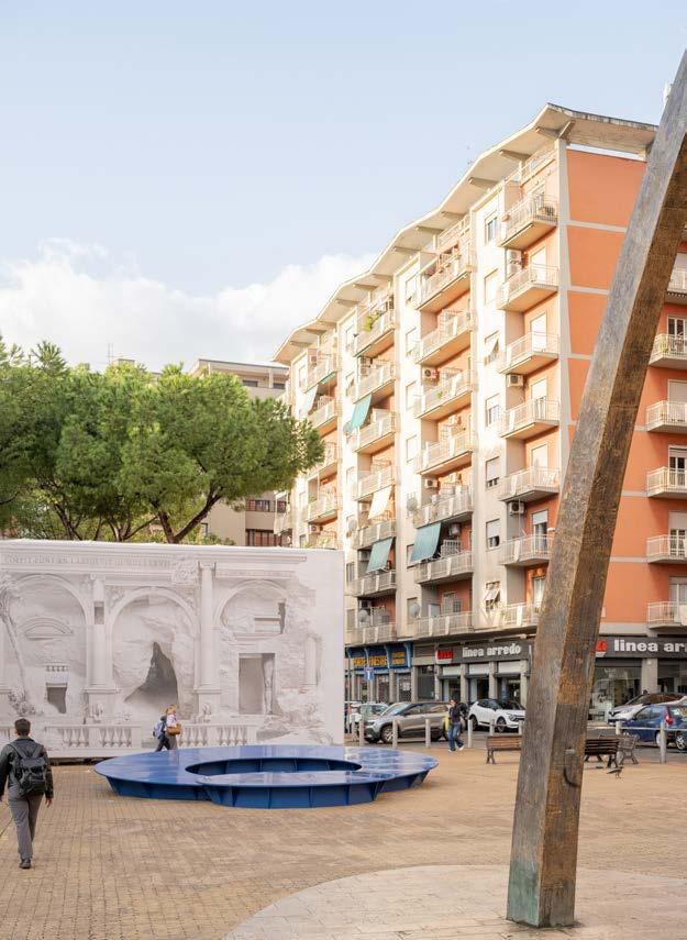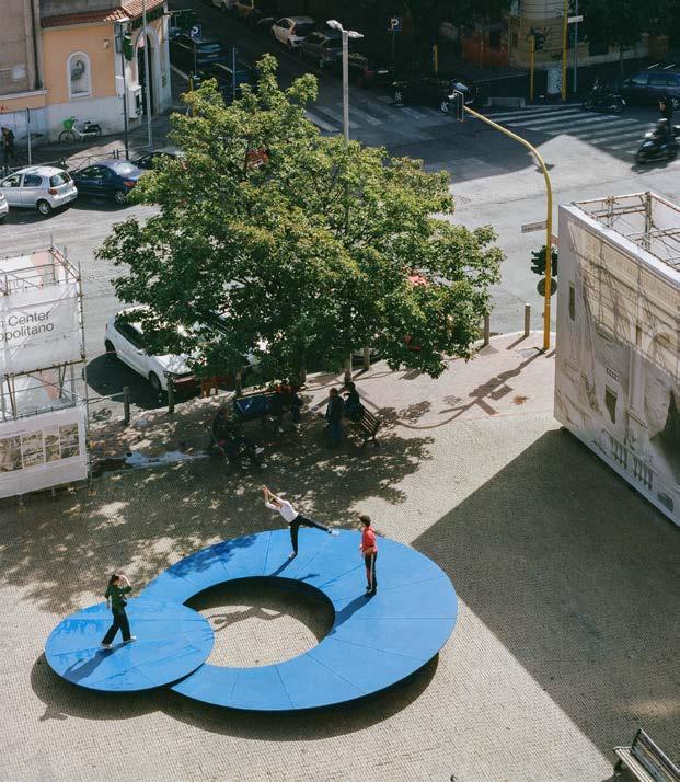 arti di strada si fondono con la comunità in un abbraccio inclusivo. Il progetto si configura come un palcoscenico urbano, un luogo di aggregazione spontanea dove si risvegliano l’interesse pubblico e la partecipazione civica. Realizzata interamente in legno, la struttura presenta un design radiale, simmetrico e baricentrico, con un anello inclinato di 7 metri di diametro e una piattaforma piana di 3,5 metri di diametro. La finitura è stata realizzata con una vernice blu a base d’acqua per legno, adatta per l’esterno.