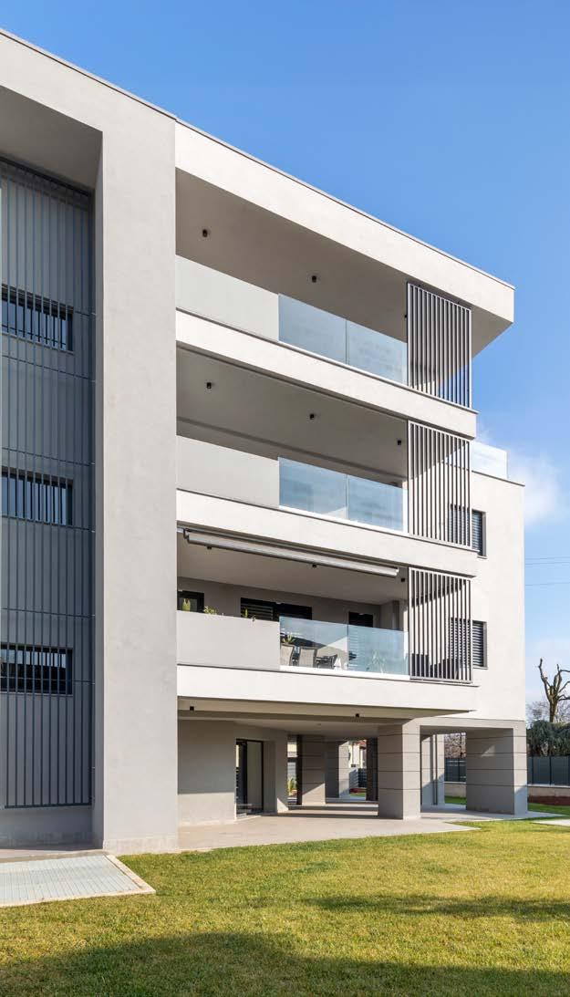 la realizzazione in Classe A3. Gli spazi esterni, sia comuni sia privati, sono stati accuratamente disegnati, dotando ogni appartamento di uno o più terrazzi con profondità di oltre 3 metri, bbq e locale tecnico dedicato a ospitare la pompa di calore a gestione autonoma. Anche gli elementi a verde sono stati selezionati con attenzione, così da dare vita a uno spazio comune di qualità che accoglie abitanti e visitatori. I prospetti dell’edificio sono caratterizzati dalle grandi balconate e sul retro dai sistemi di oscuramento del vano scala. Il tetto si presenta piano e ospita, nascosti alla vista, l’impianto fotovoltaico e le unità di ventilazione.