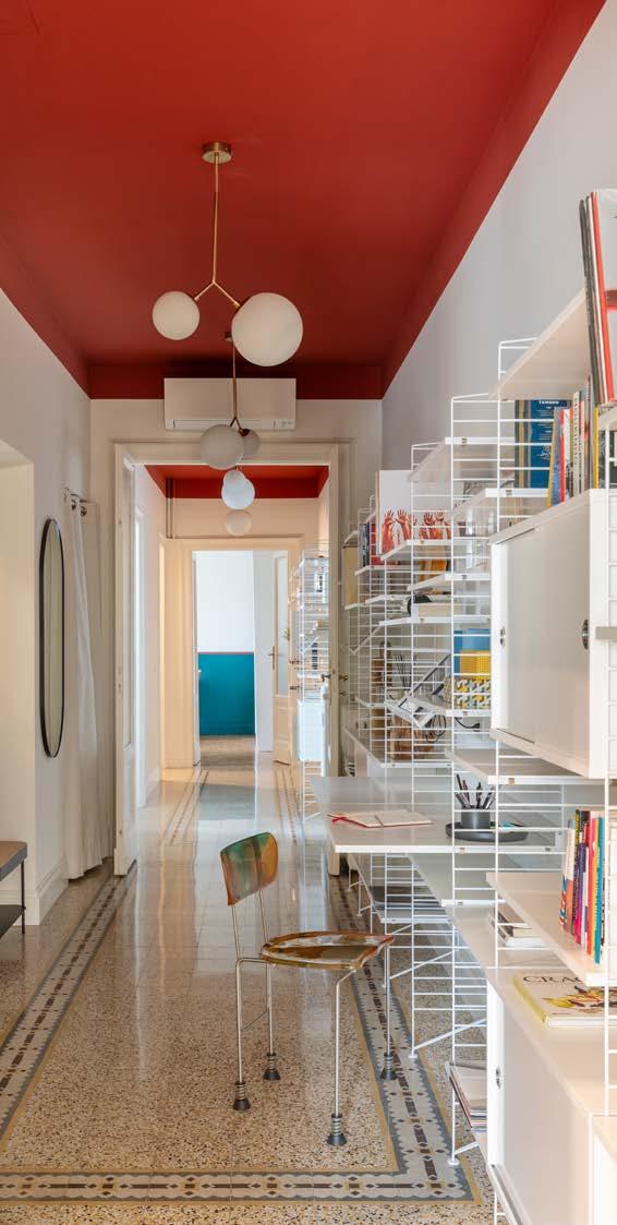 Il corridoio è lungo 11 metri e acquista risalto grazie alle decise scelte cromatiche e all’arredo che lo completa interamente con una libreria dotata anche di una piccola scrivania. Nel bagno, stretto e lungo, una doccia passante ha consentito di ottenere due bagni caratterizzati da nuovi rivestimenti riconoscibili. Uno dei due bagni si apre sul corridoio, mentre il secondo è accessibile dalla camera. Quest’ultima dialoga con il resto della casa riprendendone colori e finiture.