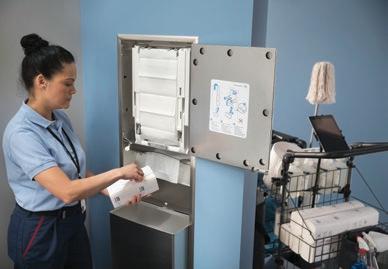 capacità di 2.100 asciugamani di carta, che vengono dispensati rapidamente e senza interruzioni. Le risme compresse possono essere caricate rapidamente in qualsiasi momento, trasportate e stoccate senza difficoltà in modo da consentire al personale di dedicarsi all’attività di pulizia piuttosto che alle ricariche.