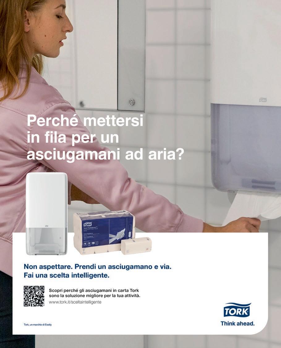 la salute. E i dati ci confermano che il 68% delle persone desidera che nelle strutture ci siano asciugamani di carta in alternativa agli asciugamani ad aria. Le ragioni più comuni indicate per questo cambiamento sono la percezione che gli asciugamani di carta siano più igienici (80%), che le mani vengono asciugate più rapidamente (42%) e che si diffondano meno batteri nell’aria (39%). Aree bagno sempre ordinate e attrezzate con prodotti e materiali per l’igiene adeguati possono dire molto di noi e della nostra attenzione verso clienti e collaboratori. E all’interno di aree ad alto traffico con un ampio numero di visitatori, la vera sfida è mantenere un buon flusso di traffico ed evitare code. La soluzione è Tork PeakServe, il rivoluzionario dispenser a erogazione continua che permette di servire il 250% di ospiti in più tra una ricarica e l’altra grazie alla straordinaria