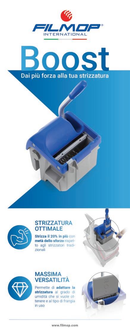 termini di strizzatura e impregnazione della frangia, indipendentemente dalla pressione esercitata sul manico. L’esclusivo strizzatore è progettato per tutelare la salute dell’operatore che non è più costretto a esercitare uno sforzo intenso e ripetuto aumentando la probabilità di sviluppare disturbi muscoloscheletrici: è sufficiente accompagnare il manico fino a fine corsa per ottenere subito la strizzata ideale, senza dover ripetere l’operazione più volte per raggiungere il risultato desiderato. Boost è dotato di un innovativo sistema di regolazione che permette di ottimizzare il livello di strizzatura in base al grado di umidità che si vuole ottenere e al tipo di frangia in uso, adattandosi sia al filato rasato sia a quello strutturato. Appositamente pensato per l’utilizzo con i sistemi di lavaggio piatti, Boost è liberamente abbinabile a tutte le linee di carrelli Filmop e alla speciale gamma di secchi strizzatori. www.filmop.com