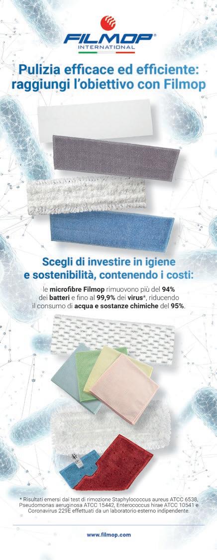 I CAM per i servizi di pulizia e sanificazione mirano a contenere gli impatti ambientali incentivando l’utilizzo di prodotti e sistemi che riducono il consumo di detergenti e disinfettanti. Filmop offre un’ampia varietà di panni e frange in microfibra conformi ai CAM che permettono di pulire efficacemente ogni tipo di superficie, riducendo il consumo di acqua e sostanze chimiche del 95% grazie all’alto potere assorbente. I sottilissimi filamenti che caratterizzano l’intera gamma penetrano in ogni porosità catturando lo sporco e rilasciandolo solo in fase di lavaggio dei tessili. Test condotti da laboratori esterni indipendenti hanno inoltre evidenziato l’elevata efficacia nella rimozione batterica e virale: nello specifico, le microfibre Filmop rimuovono più del 94% dei batteri Staphylococcus aureus ATCC 6538, Pseudomonas aeruginosa ATCC 15442 ed Enterococcus hirae ATCC 10541 e fino al 99,9% del Coronavirus 229E.