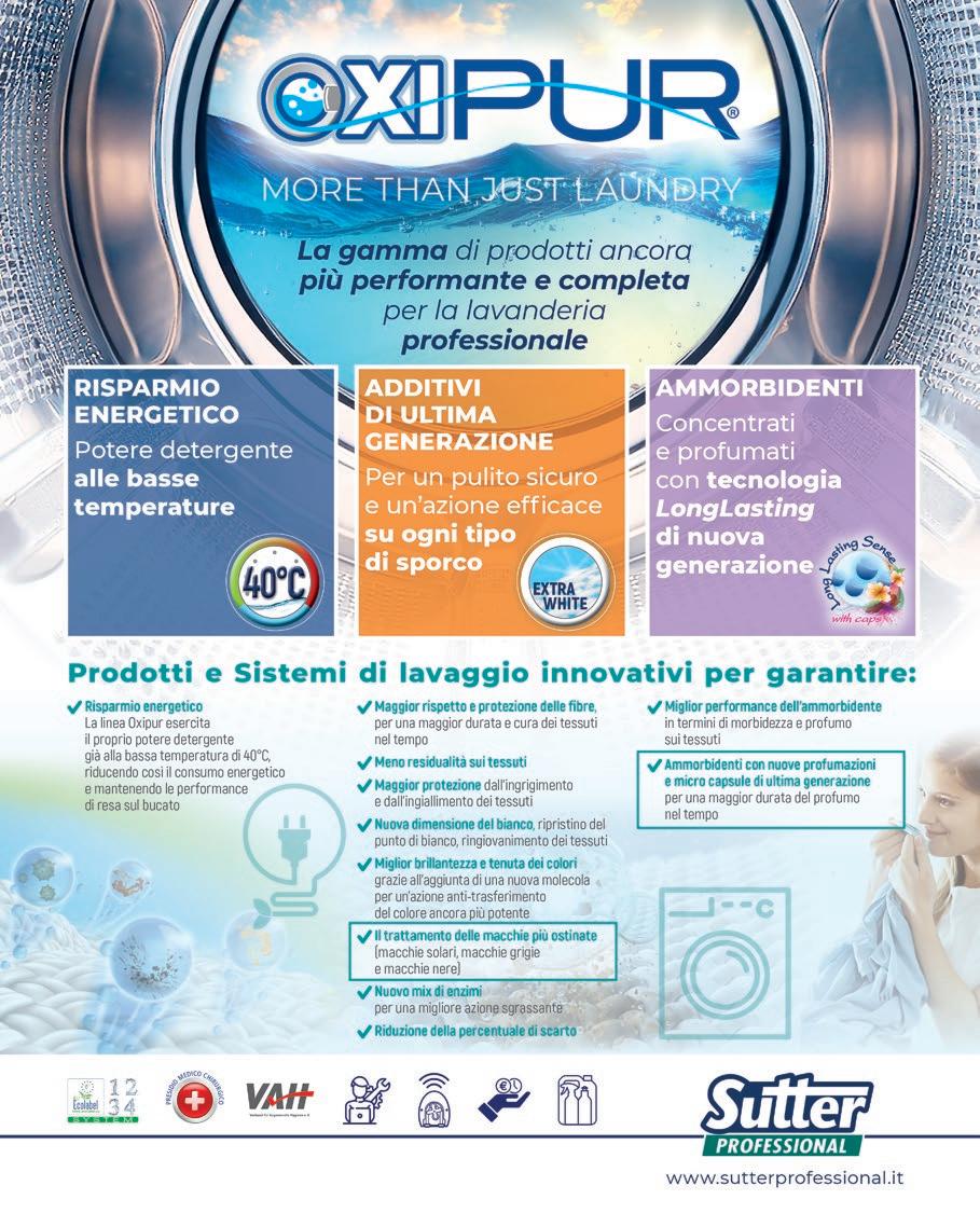 dei consumi energetici e rispetto per l’am biente, rispondendo alle necessità specifi che delle lavanderie moderne. Scopri tutte le novità del mondo Oxipur come i nuovi ammorbidenti Soft Power Caps White e Pink. Il nuovo Oxy Boost, additivo attivatore di ossigeno nel bagno di lavaggio così come PolYS Extra per la rimozione di macchie di creme solari e Whitener per ritro vare il bianco originario dei tessuti. Nuovo anche Oxacid Powder, per il ripristino dei tessuti ormai ingialliti e invecchiati. #StayTuned www.sutterprofessional.it