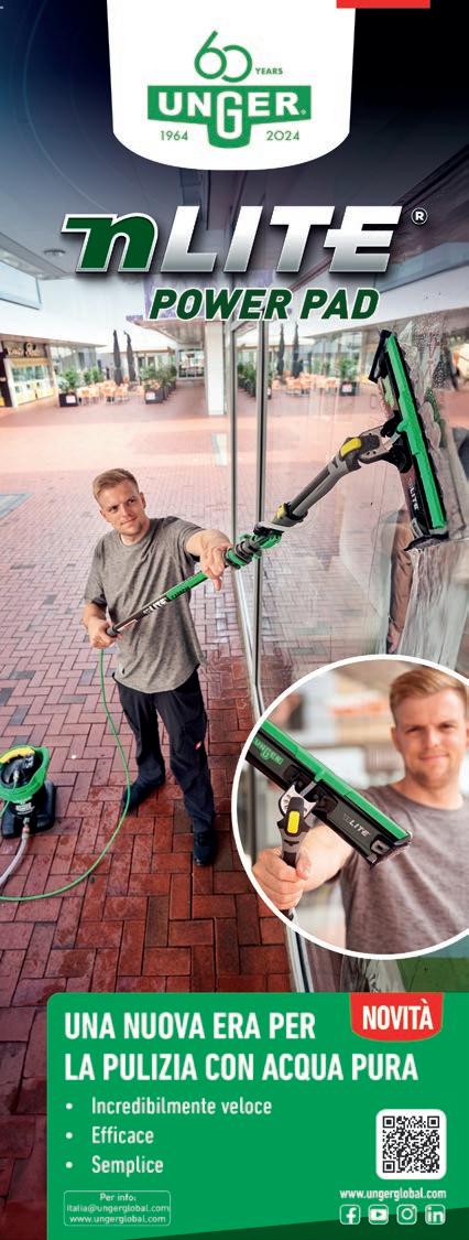 Il nuovo nLITE® PowerPad di UNGER inaugura una nuova era per la pulizia con acqua pura di grandi superfici di vetro fino al 1° piano (6 m). Il pad di pulizia in microfibra ad alta efficacia del PowerPad nLITE® asporta più efficacemente e più rapidamente la sporcizia, offrendo una superficie di contatto molto più ampia rispetto alle setole di una comune spazzola idrica. La Rinse Bar integrata risciacqua in modo permanente e su tutta la larghezza con acqua pura tramite speciali ugelli, creando così un effetto autopulente. Inoltre, la microfibra resistente scivola facilmente sulla superficie del vetro. A sinistra, a destra, in alto o in basso: grazie allo Swivel a 360°, il PowerPad nLITE® offre la massima mobilità. Mantiene un contatto permanente con la superficie da pulire in qualsiasi posizione di lavoro, rendendo la pulizia in posizione laterale più facile ed efficiente. La funzione girevole può anche essere bloccata in sette posizioni con l’aiuto del Swivel Lock. Questo garantisce risultati di pulizia ottimali! Mantenendo un movimento simile a quello della pulizia tradizionale dei vetri, è possibile ottenere risultati perfetti con la pulizia con acqua pura utilizzando il PowerPad nLITE®, senza bisogno di un prolungato periodo di addestramento. Il nuovo PowerPad nLITE® è completamente compatibile con il sistema di aste idriche nLITE e di aste telescopiche OptiLoc del marchio professionale UNGER. Il PowerPad nLITE®, presentato per la prima volta da UNGER al CMS, è disponibile nelle larghezze di 35 e 45 centimetri. È ideale per i consumatori convinti della pulizia con purificazione dell’acqua pura, ma anche per coloro che desiderano scoprire da soli la tecnologia con acqua pura. Anche la giuria di esperti dei Purus Innovation Awards ha scelto il PowerPad nLITE® 2023 come uno dei tre finalisti nella categoria “Equipment”. www.ungerglobal.com