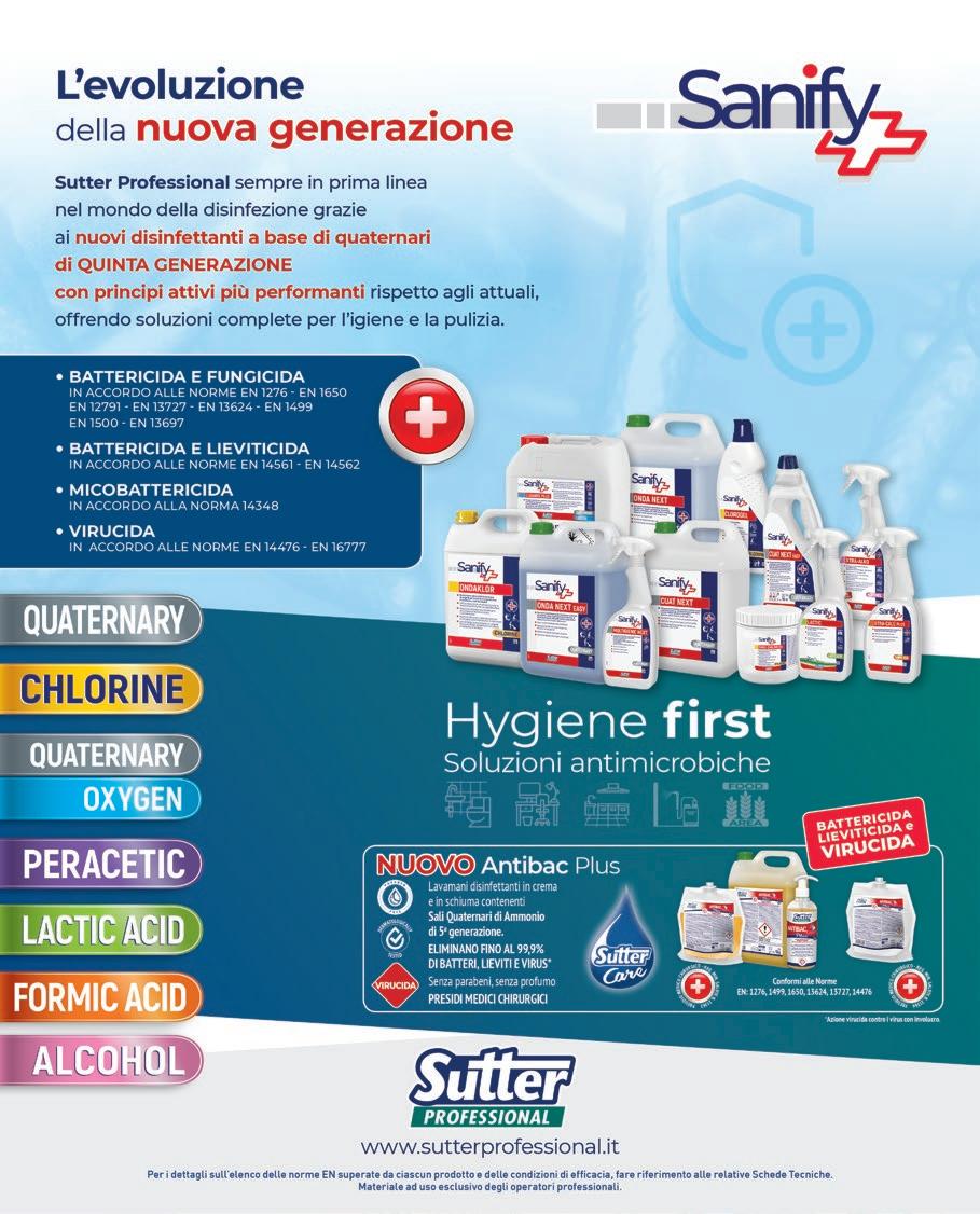 li, si completa. Dopo ONDA Next (PMC n. 20575) e la variante di profumo Onda Next Lime (PMC n. 20575), sono giunti il nuovo CUAT Next (PMC n. 20582) con proprietà virucida e ideale nel mondo HACCP perché in assenza di colore e profumo e i nuovissimi Onda Next RTU e MULTIGIENIC Next (PMC n. 20577) nel pratico flacone pronto all’uso 750ml (PMC n 21254), sempre virucida. Le novità nel mondo Sanify continuano con le varianti super concentrate: Onda Next Easy (PMC n. 21155) e Cuat Next Easy senza colore e profumo, ideale in ambito HACCP (PMC n. 21160), entrambi virucida. Grosse novità anche per la gamma Ratio, il sistema di dosaggio in pouch. Nuova certificazione come PMC anche per BK-2 (PMC n. 21361) e per RB-3 (PMC n. 21373). Entrambi i prodotti sono a base di quaternari di 5° generazione e hanno la norma EN virucida. Anche il mondo dei bag-in-box con la gamma Pick-a-box,