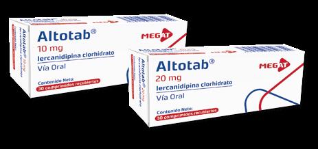 Altotab (Lercanidipina) es un calcioantagonista dihidropiridínico, un medicamento altamente eficaz y seguro en el tratamiento de la hipertensión arterial, por su potente efecto antihipertensivo, solo o en combinación. Comparado con otros fármacos de su grupo, ofrece una vida media más prolongada y reduce efectos adversos como la hinchazón o el edema en las extremidades inferiores. El mecanismo de acción de la lercanidipina se distingue de otros medicamentos porque actúa directamente sobre la absorción de calcio en las paredes musculares de las arterias, provocando una vasodilatación directa que contribuye a la reducción, tanto de la presión arterial sistólica como diastólica.