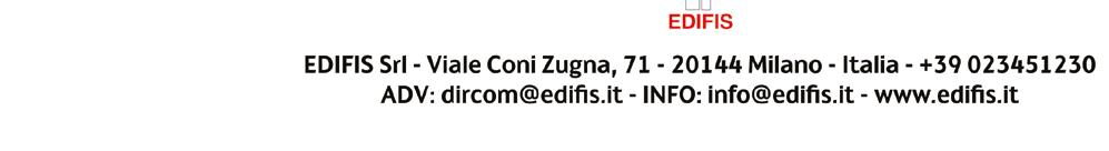 Tutti i diritti di riproduzione degli articoli e/o foto sono riservati. Manoscritti, disegni, fotografie e supporti audio e video anche se non pubblicati non saranno restituiti. Ai sensi del Reg.EU 679/2016 l’Editore garantisce la massima riservatezza nell’utilizzo della propria banca dati con finalità redazionali e/o di invio del presente periodico. Ai sensi dell’art. 15 il ricevente ha facoltà di esercitare i suoi diritti fra cui la cancellazione mediante comunicazione scritta a EDIFIS S.r.l. - Viale Coni Zugna 71 - 20144 Milano (o ai riferimenti sotto trascritti), luogo della custodia della banca dati medesima.