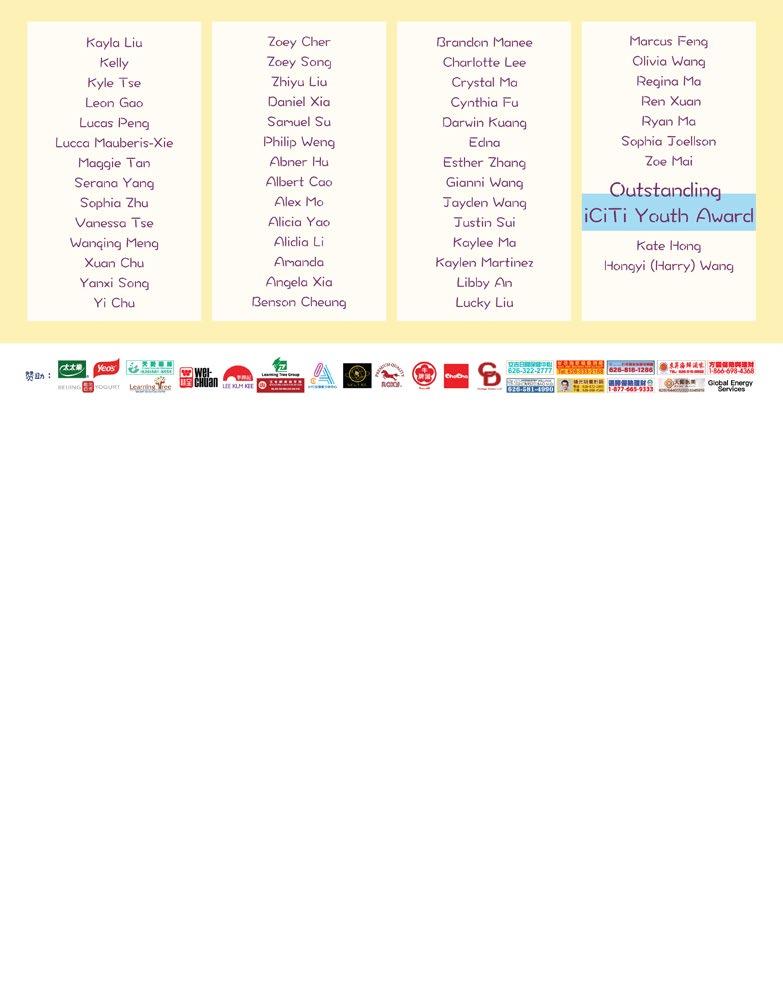 感谢本次活动「城市儿童绘画比赛」冠名赞助商华美银 行,表演单位IAEC雅利舞蹈校,以及赞助商南加州青少年魔 术联盟、美国东锦、天爱药房、安吉保健中心、汪老师美术 学院、包炜医学博士、好景海鲜烧腊酒楼、杨光明会计师、 心希尔家庭护理集团、天懿医美、方圆保险与理财、东升海 鲜酒家、太太乐、Gastone Lago、Global Energy Services、尔湾新力卓越教育、陈校长美升学规划机构、Prime Plus Food北京酸奶、味全、Walnut International Montessori Preschool、李锦记、Learning Tree Group、亚 裔青少年中心、选胜保险、杨协成、力成贸易、牛头牌、和 乐-恰恰瓜子等爱心赞助单位的大力支持(排序不分先后)。