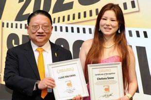 凭借卓越的艺术表现力与长期的社区服务,获奖作品 《I LOVE YOU, CHINA》的表演者Chelsea Snow不 仅荣获最佳微视频奖,更被授予“2026 C-Show 青年 大使”荣誉称号。中美电影节|中美电视节主席、美国鹰 龙传媒公司董事长苏彦韬为其颁奖。Chelsea Snow表 示:C-Show不仅是一个平台,更是一座连接中美青年心 灵的桥梁。荣获青年大使的肯定不仅是个人荣誉,更是鞭