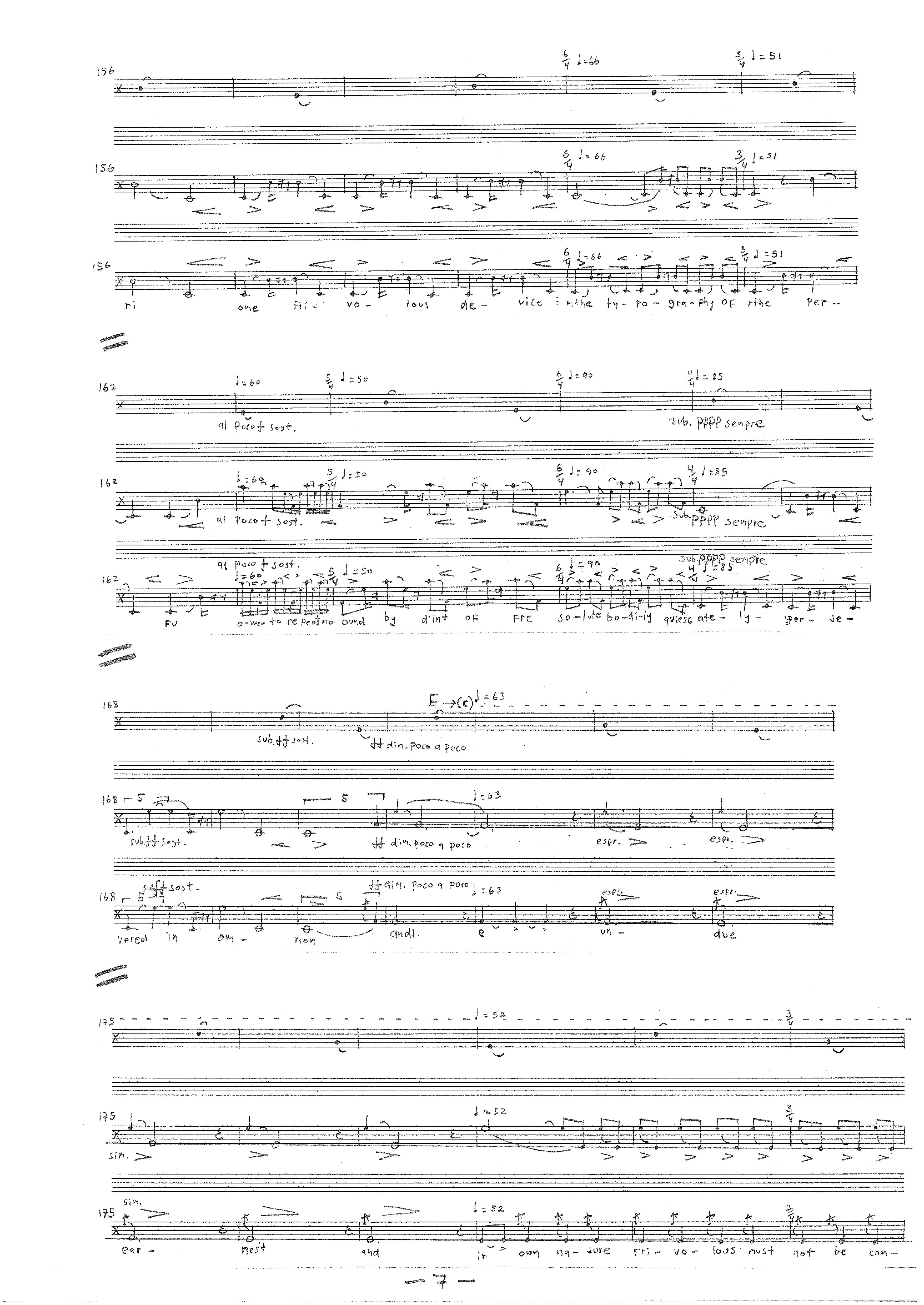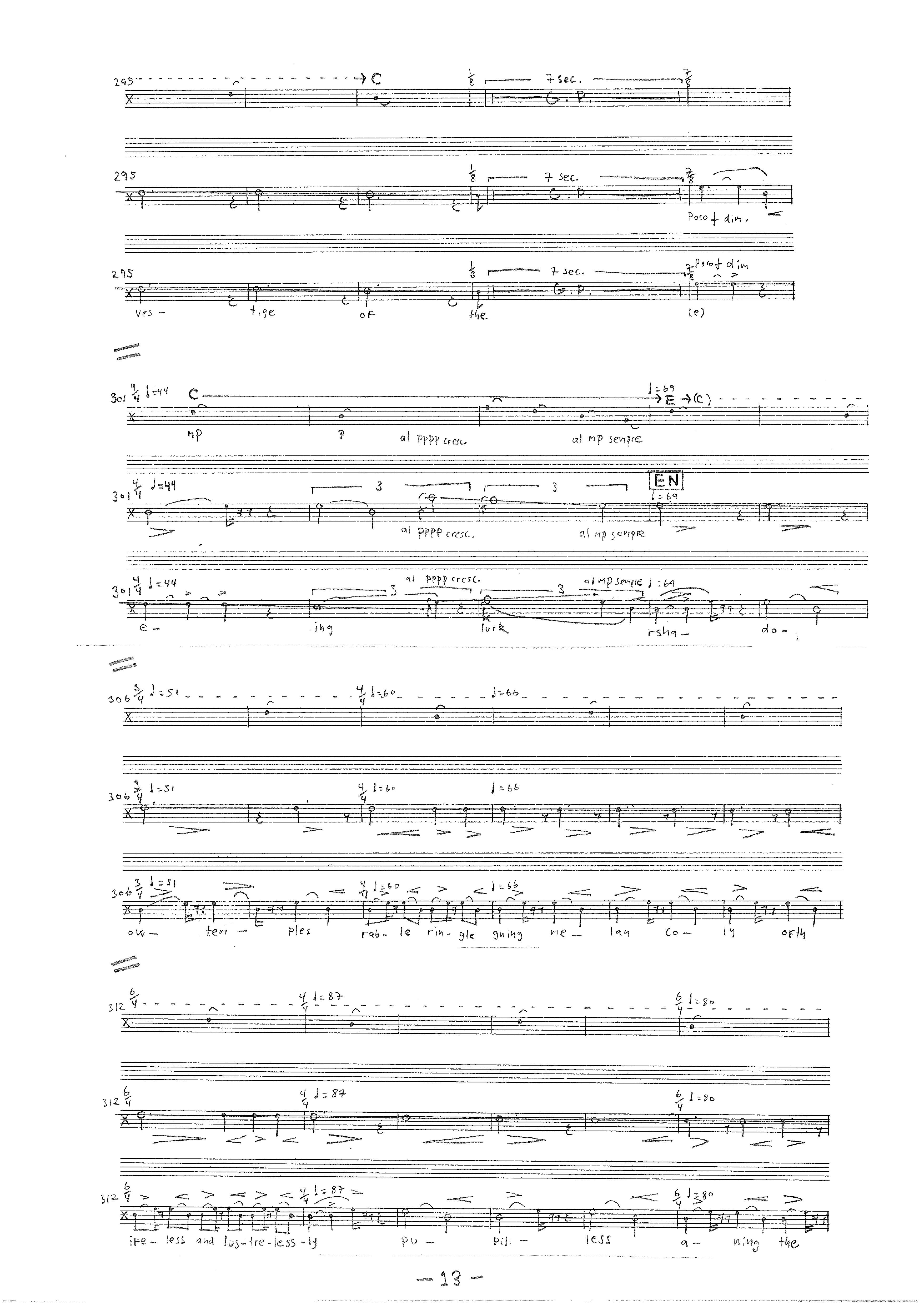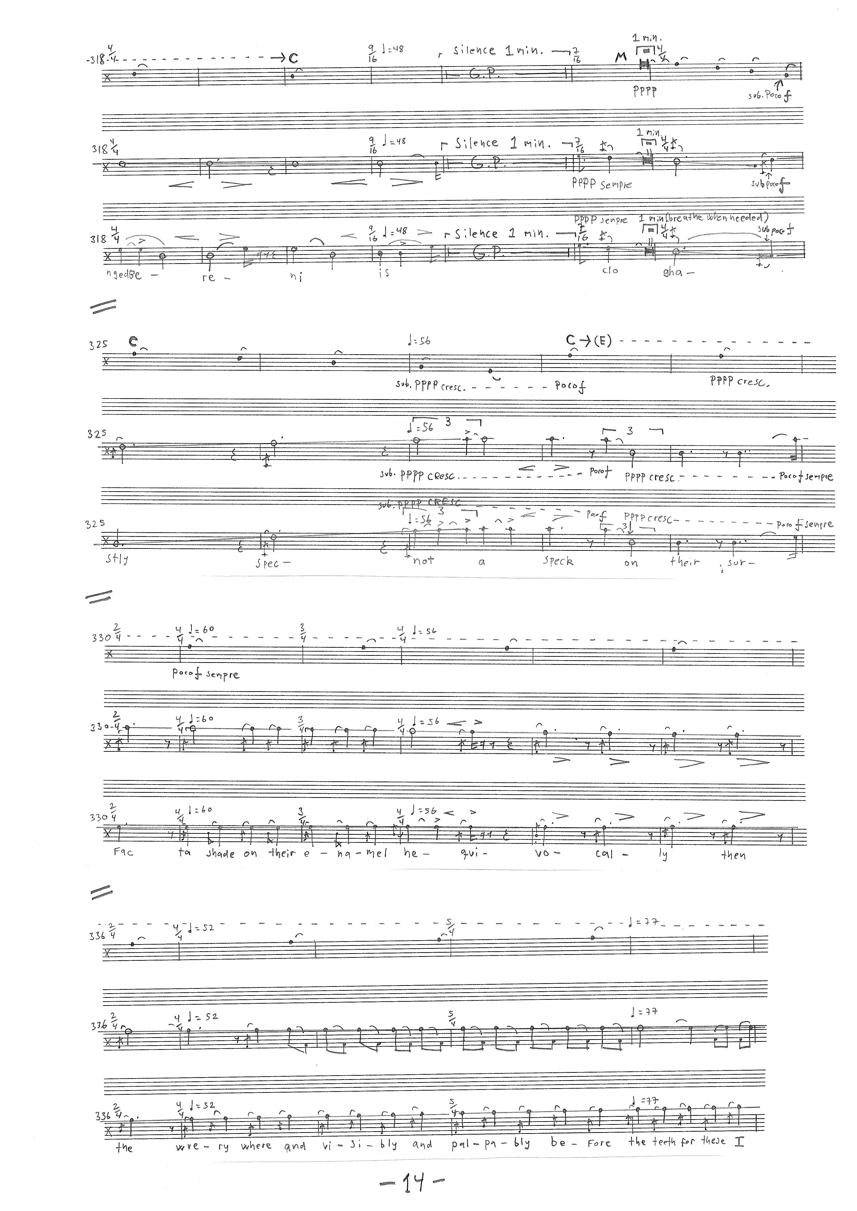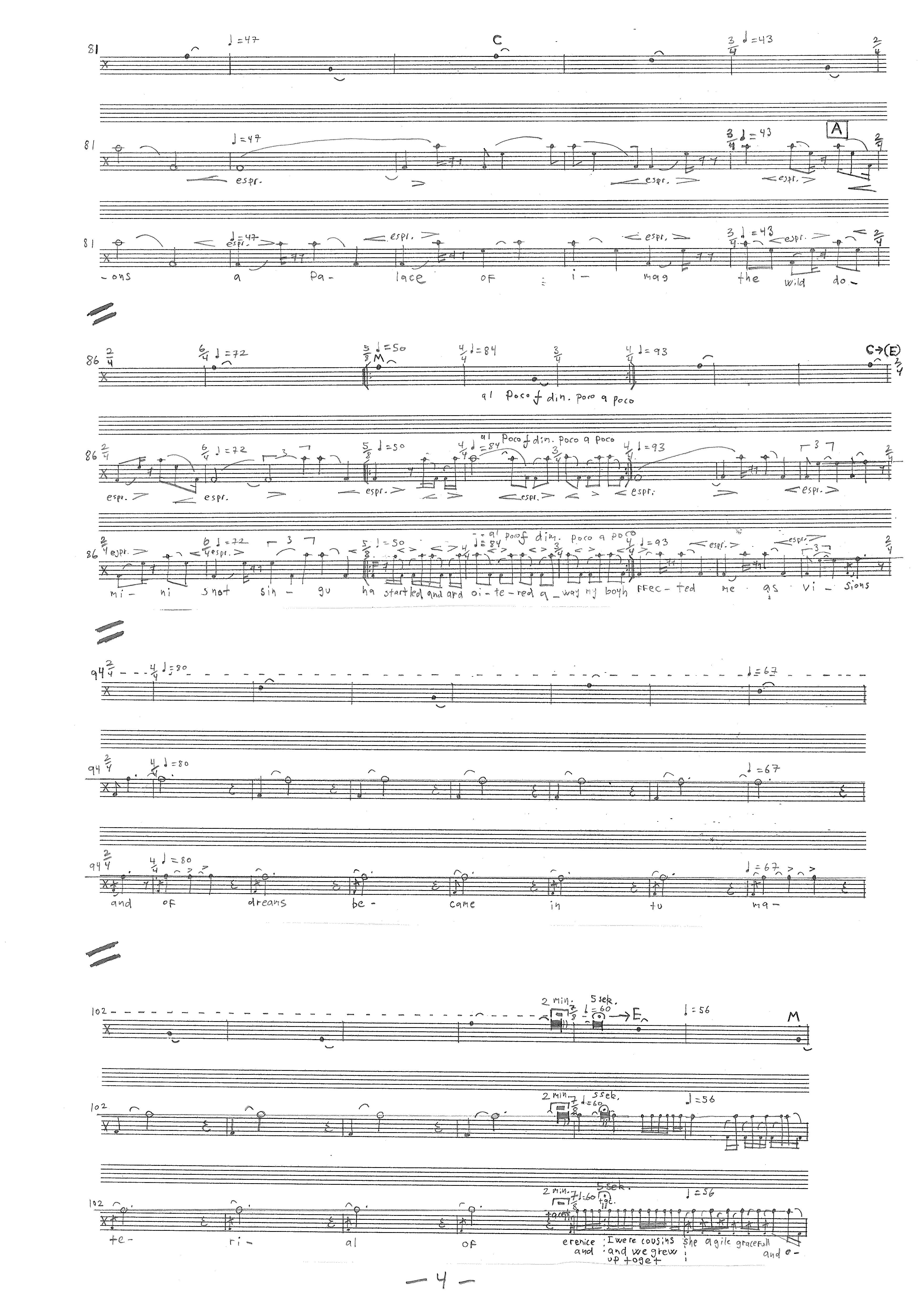 All metronome markings are suggestions. The score and parts are written in such a way that the notes are placed more closely together when the tempo is faster so that one can use the graphic appearance as an indicator. Most of the tempo changes are set up in such a way that the guitar and percussion simply can follow the soprano’s new tempo.