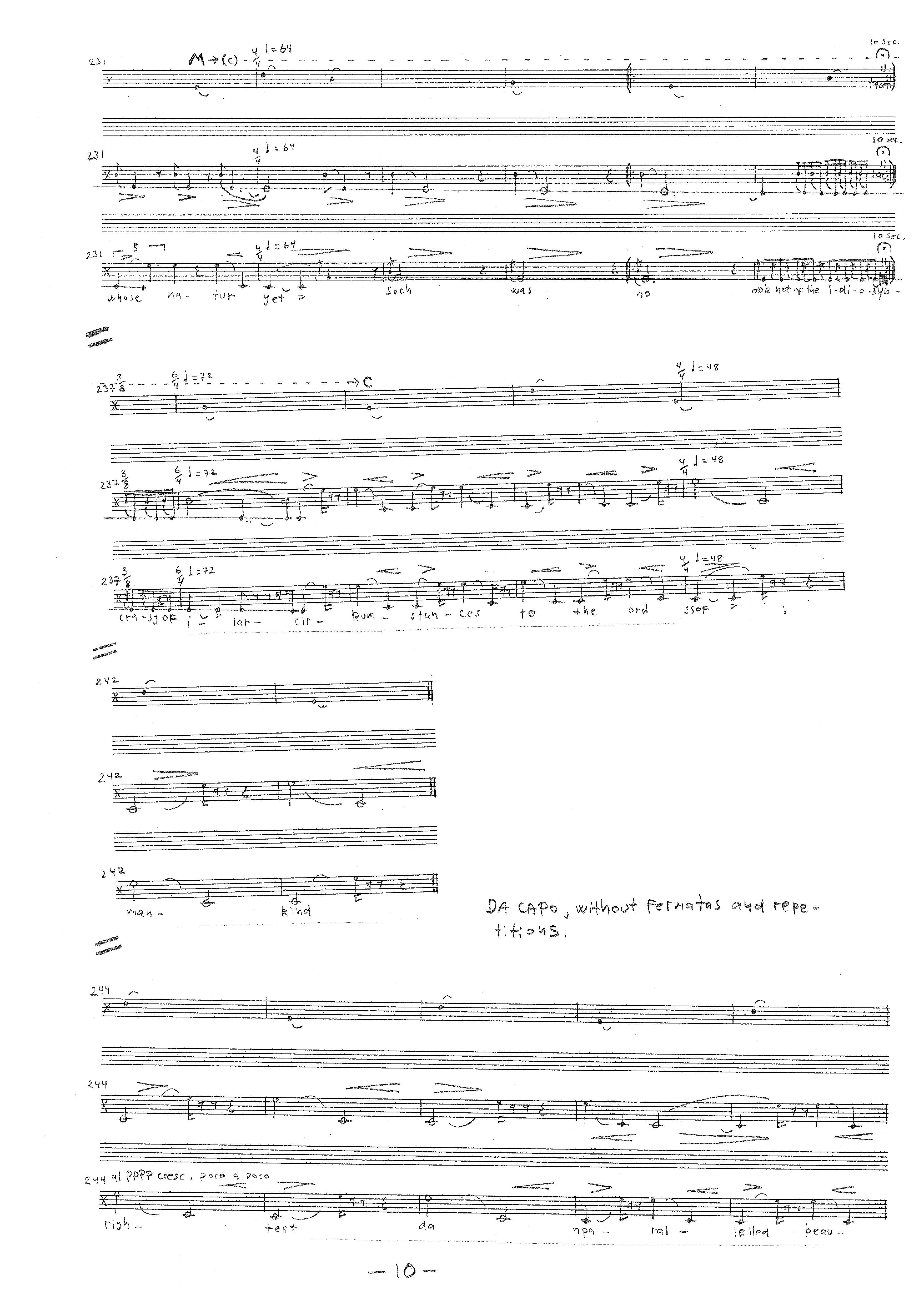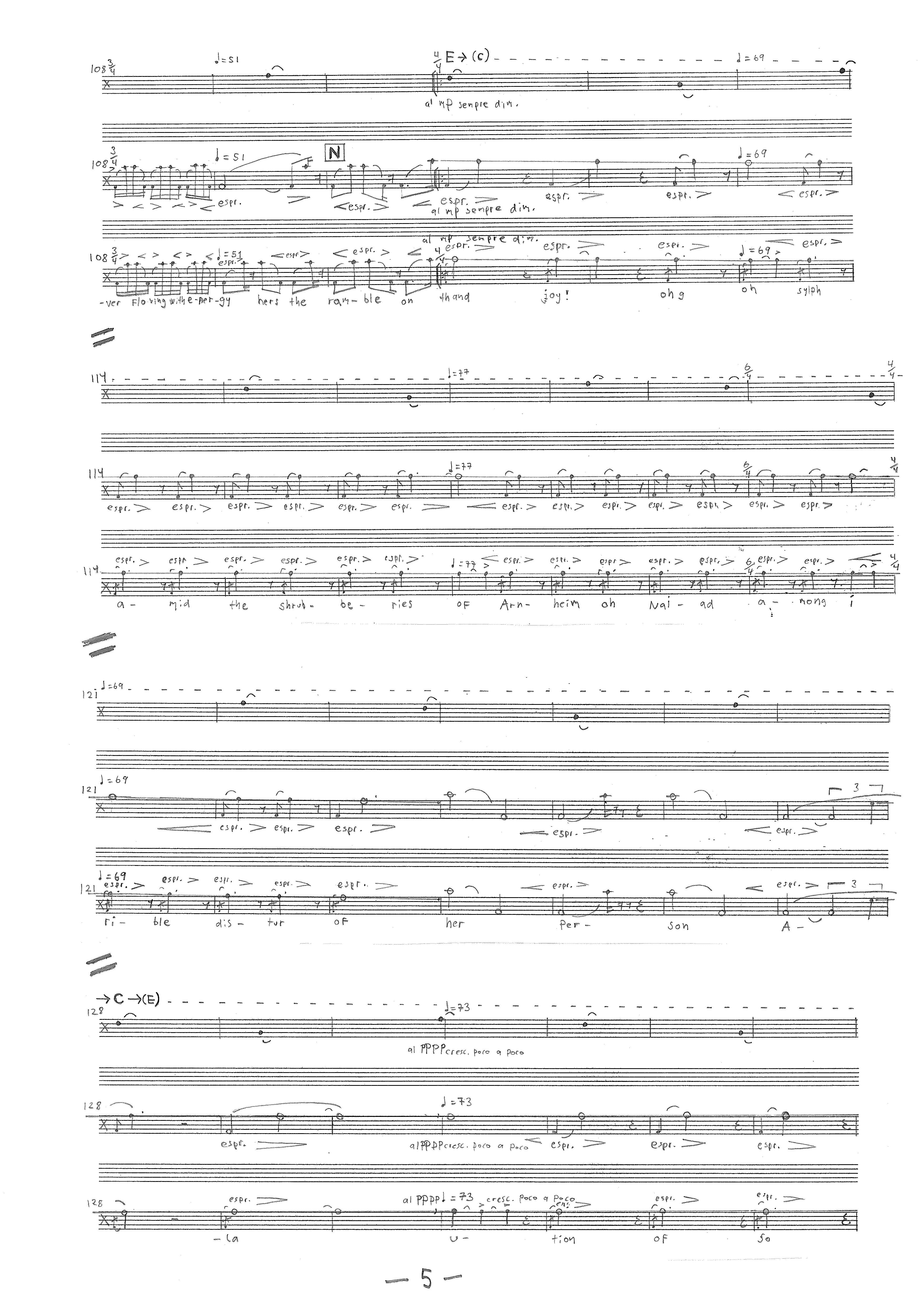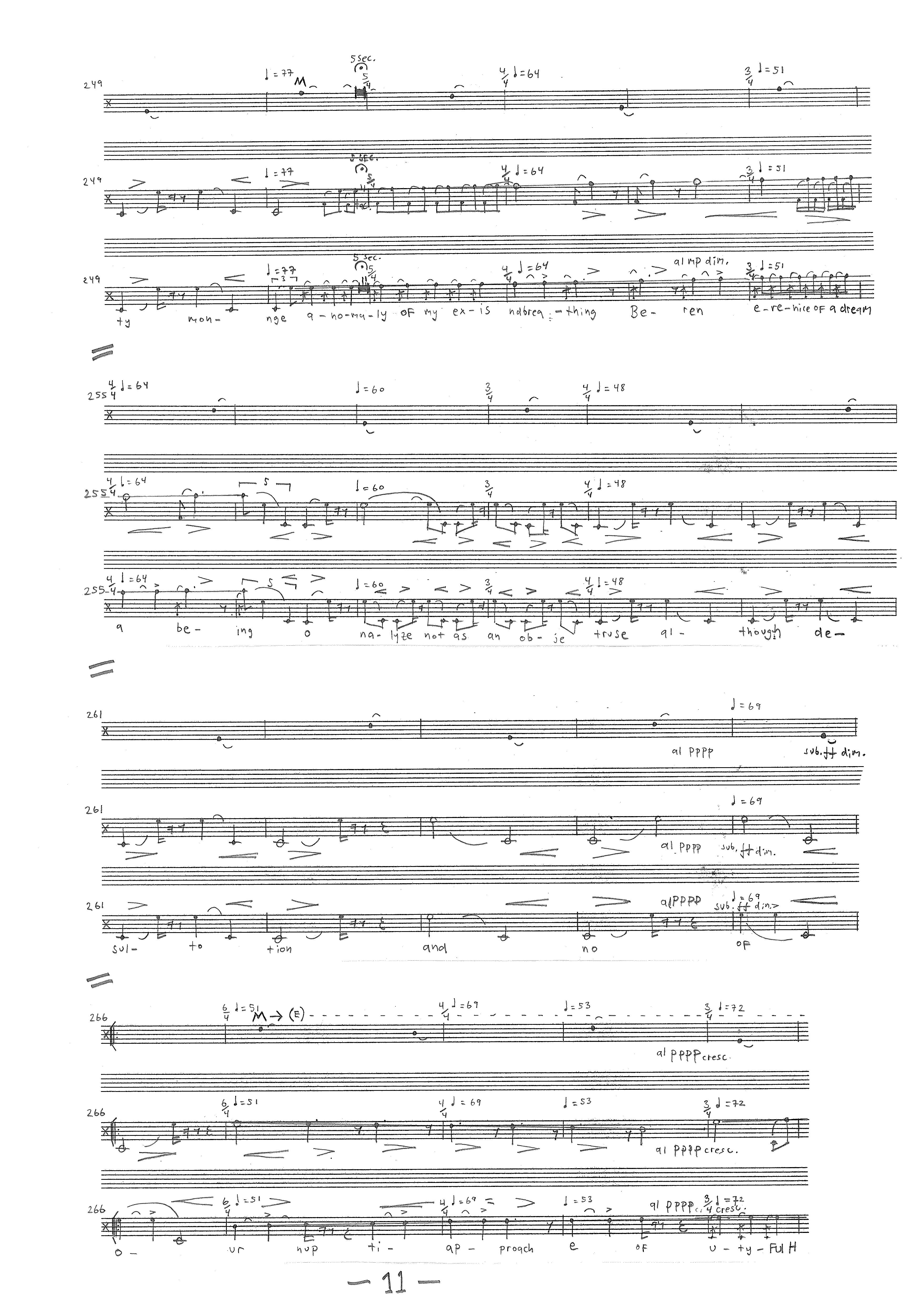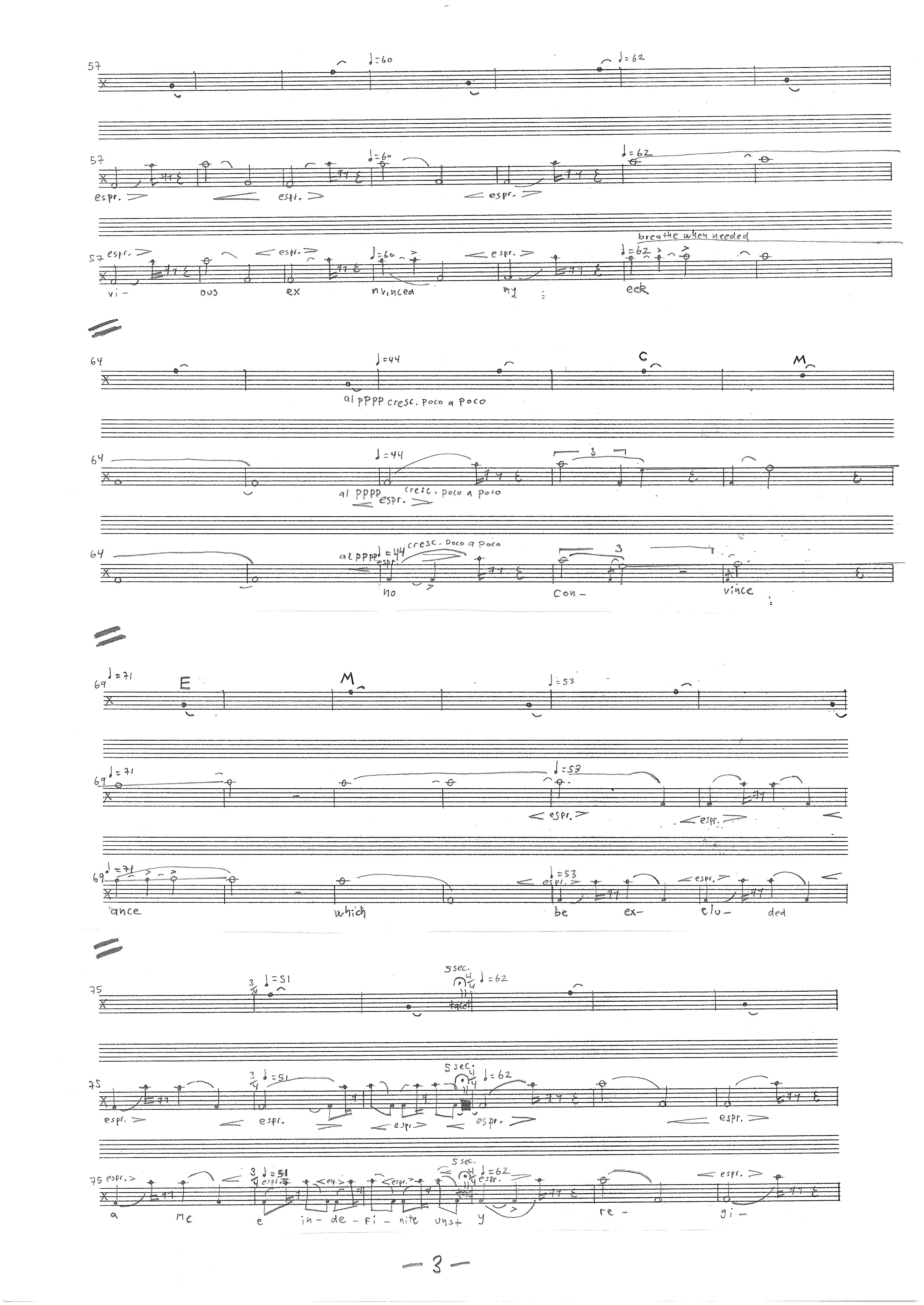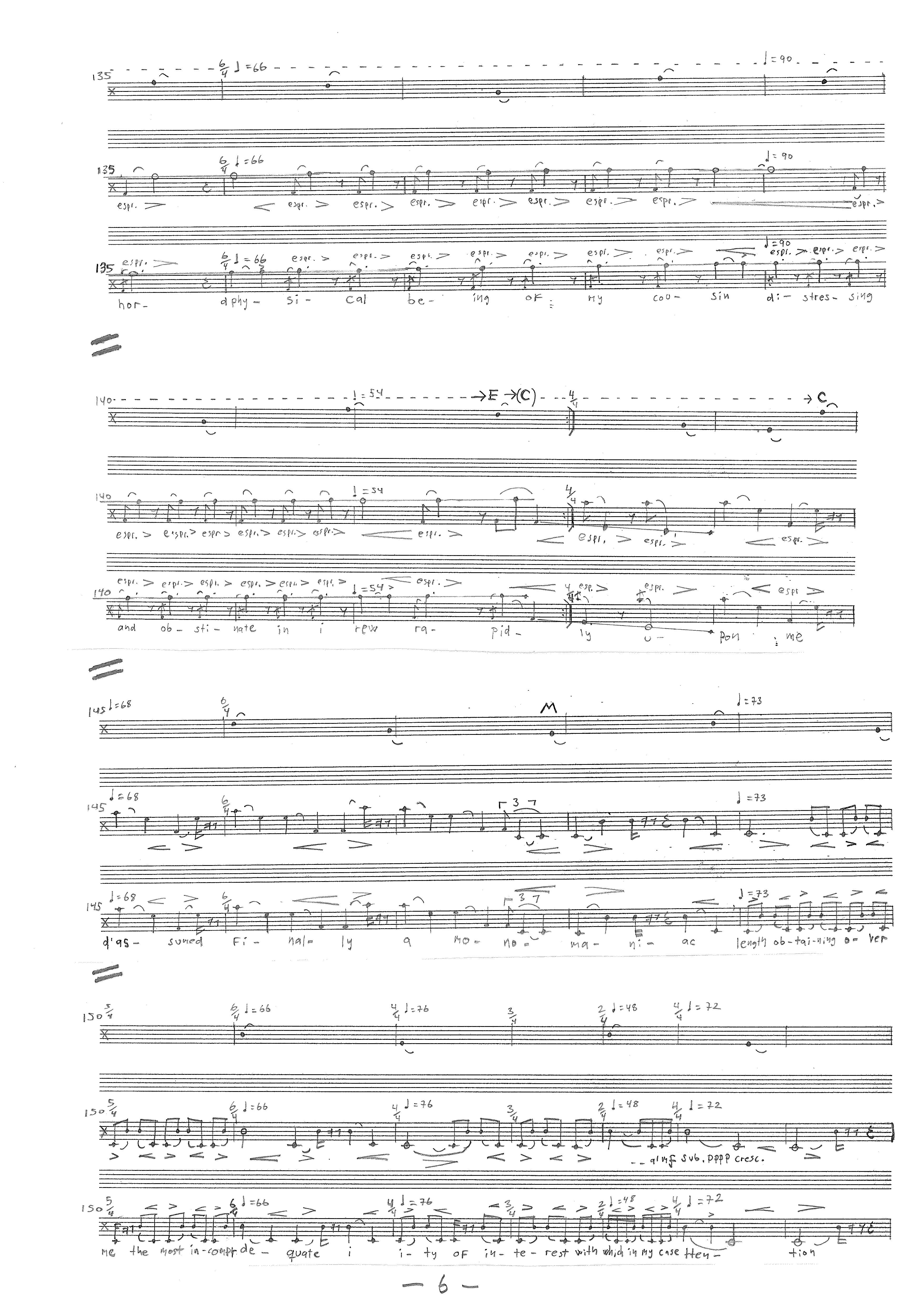 All metronome markings are suggestions. The score and parts are written in such a way that the notes are placed more closely together when the tempo is faster so that one can use the graphic appearance as an indicator. Most of the tempo changes are set up in such a way that the guitar and percussion simply can follow the soprano’s new tempo.