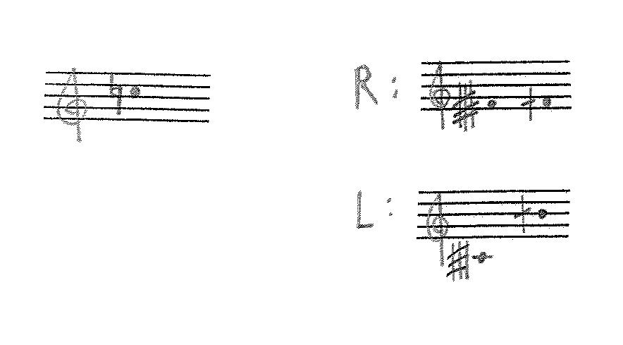 A note on the help line simply indicates a (random) note in a very high register, a note in the top space indicates a note (any) in a moderately high register etc. Glissandi between the various registers also occur. Intervals are generally not important but try to avoid octaves when shifting registers - dissonant intervals work best, although it is otherwise no catastrophe.