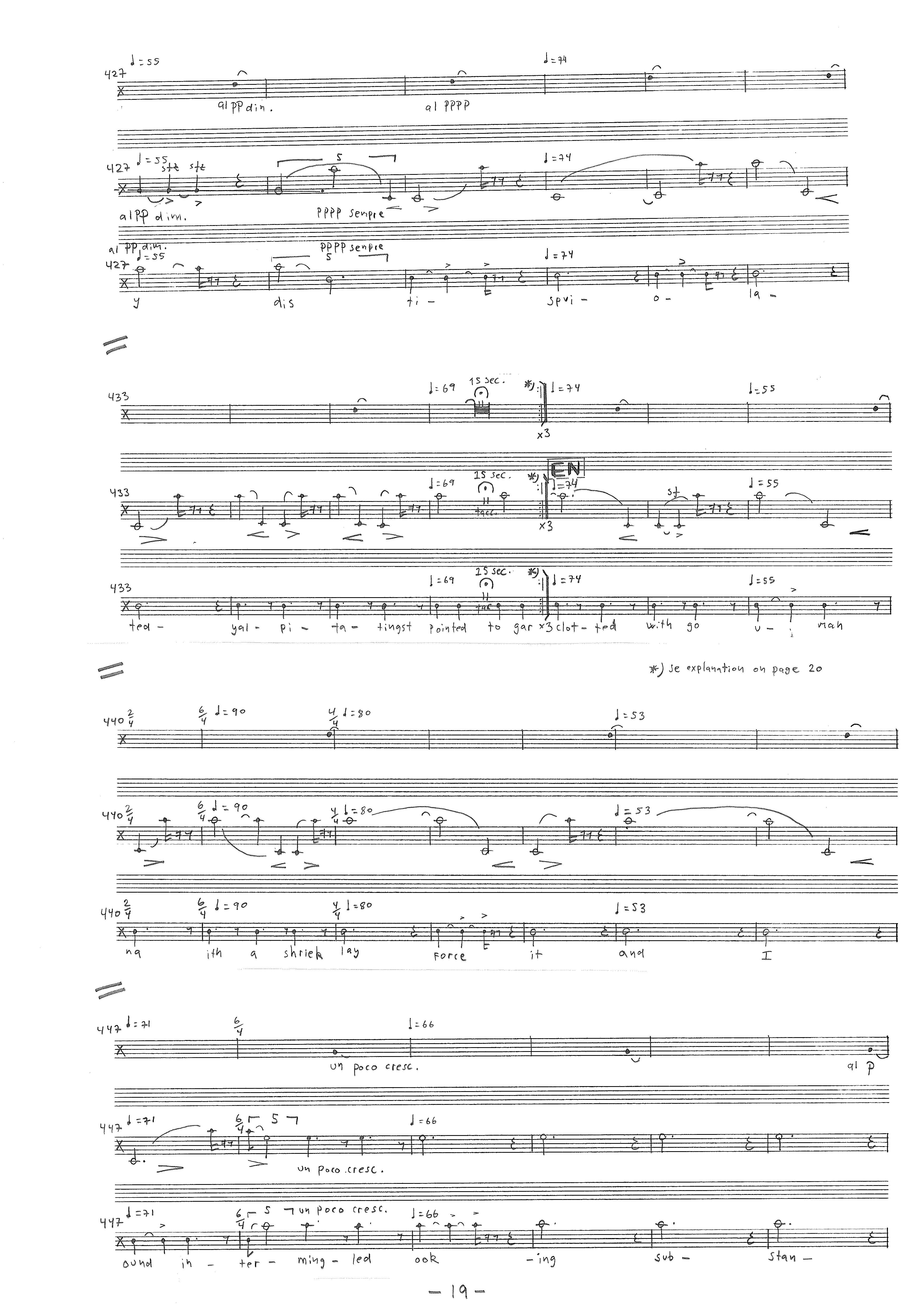 A note on the help-line simply indicates a chord in a very high register, a note in the top space indicates a chord (any) in a moderately high register etc. Glissandi between the various registers also occur.