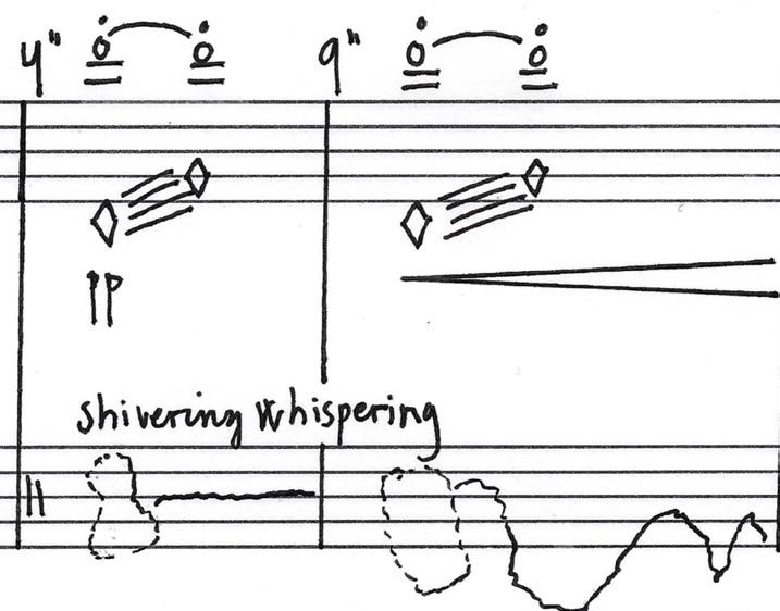 The change of random trills becomes more rapid as the x-es within the bars become more frequent on the page. These trills should be distortive at all times. The dashed arrow indicated a gradual movement from harmonic timbral trills to harmonic air trills. The second bar should be in the form of pure air trills, but with a tint of the different, rapidly changes harmonics.