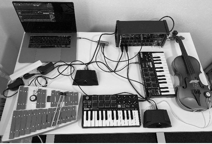 The electronic sounds are broadcast through actuators mounted on the glockenspiel, the xylophone, and the violin. No extra loudspeakers are needed.