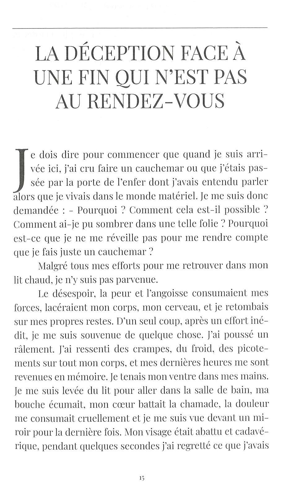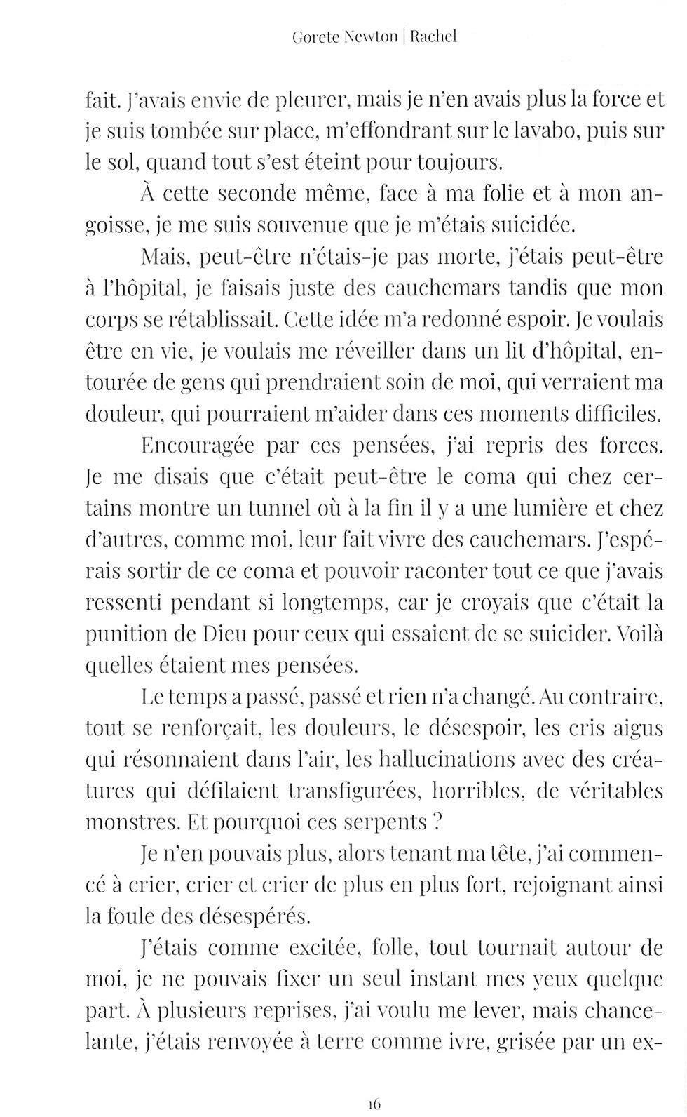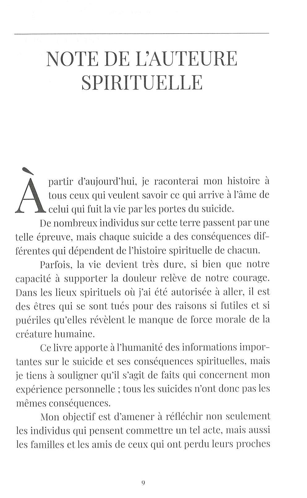Les informations fournies dans ce livre sur le suicide et ses conséquences spirituelles sont d'une importance capitale. Rachel s'est tuée au début du XX siècle. Dans cet ouvrage, elle nous raconte avec beaucoup de sensibilité son histoire personnelle, ce qui l'a amenée à commettre un tel acte, comment elle a été déconnectée de sa vie physique et les souffrances qu'elle a dû supporter jusqu'au moment de son sauvetage et de son rétablissement. Grâce aux quelques détails qui dévoilent ce qui arrive aux gens avant, pendant et après le suicide, nous espérons que ce livre sera une source de réflexion pour le lecteur, qu'il génèrera un nouveau paradigme éthique sur la question du sens réel de la vie.