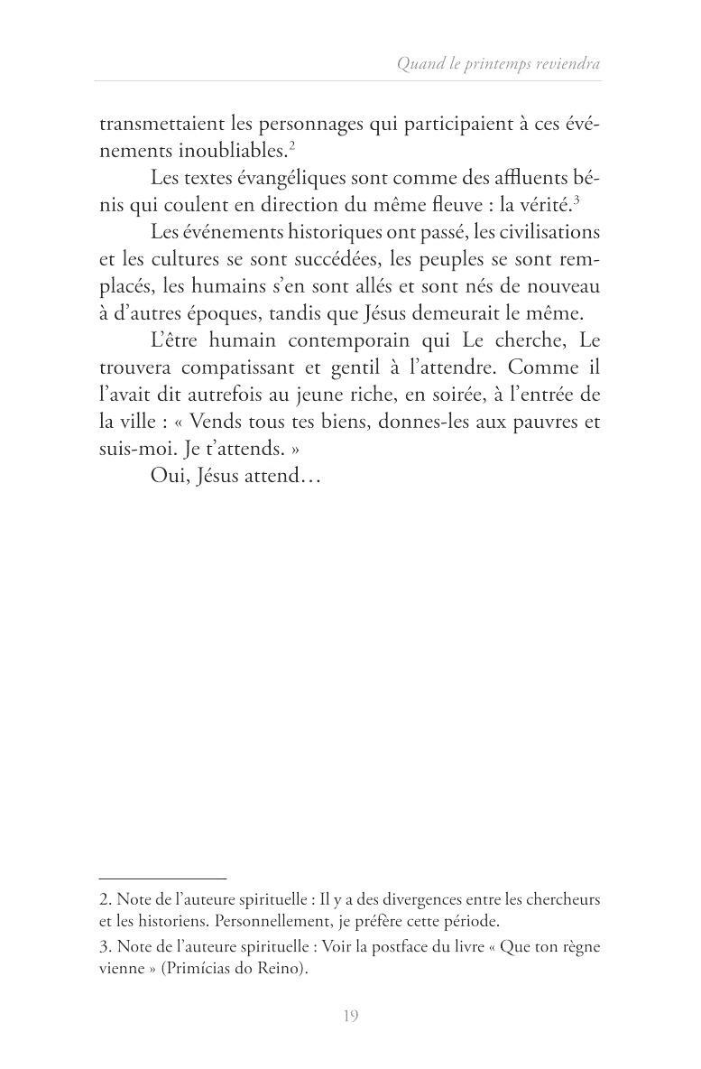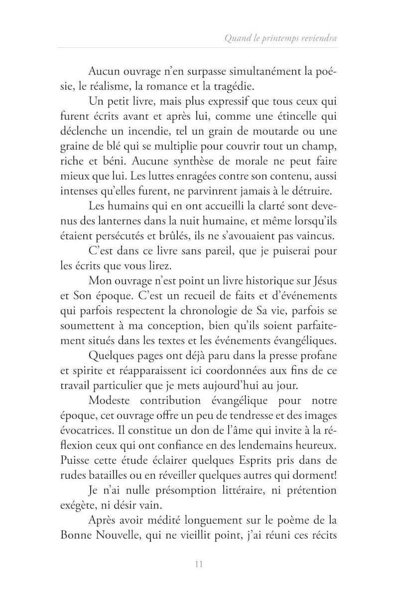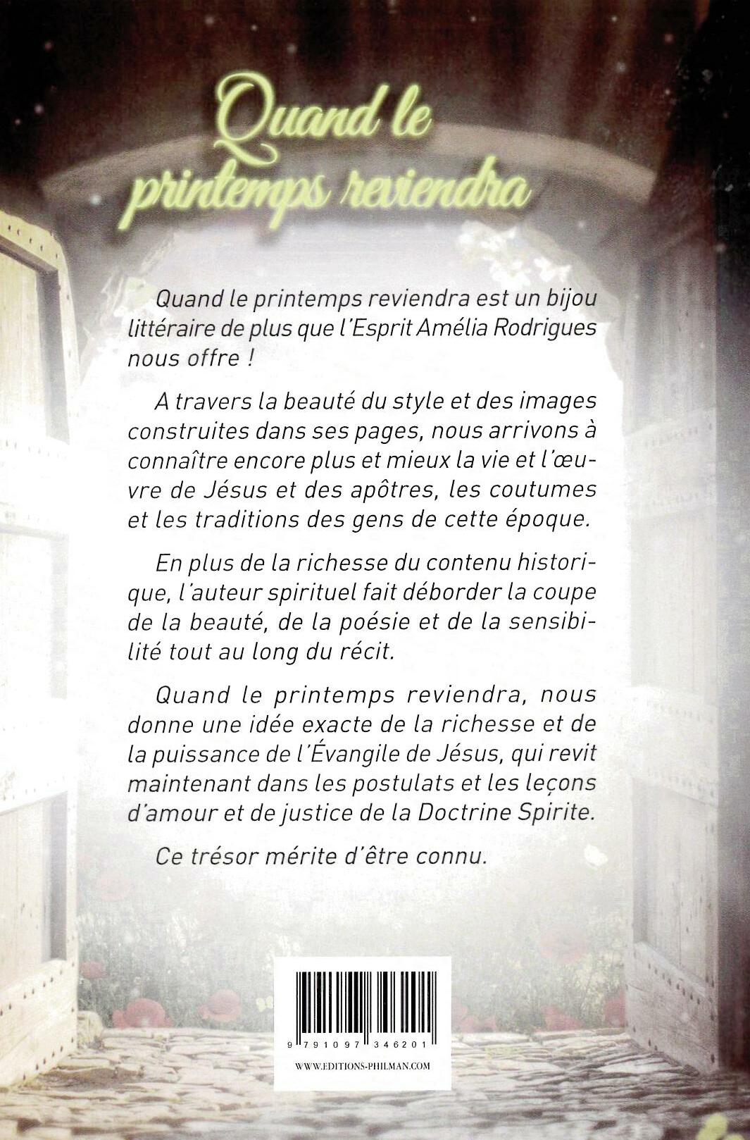 A travers la beauté du style et des images construites dans ses pages, nous arrivons à connaître encore plus et mieux la vie et l’œuvre de Jésus et des apôtres, les coutumes et les traditions des gens de cette époque. En plus de la richesse du contenu historique, l’auteur spirituel fait déborder la coupe de la beauté, de la poésie et de la sensibilité tout au long du récit. Quand le printemps reviendra, nous donne une idée exacte de la richesse et de la puissance de l’Évangile de Jésus, qui revit maintenant dans les postulats et les leçons d’amour et de justice de la doctrine spirite.