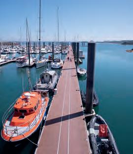 n Passerelle d'accès aux pontons et ponton de desserte adaptés (surfaces podotactiles et guides roues). Access bridge to adapted pontoons and service pontoons (tactile surfaces and wheel guides).