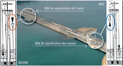 Les 2 mâts situés sur le barrage au niveau de l’usine et des vannes permettent d’identifier si l’estuaire de la Rance se vide ou se remplit