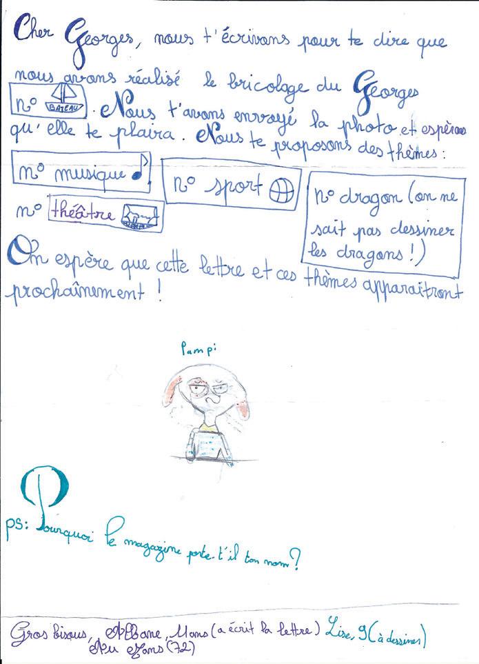 Enfin, petit message pour Albane et Lise car nous n’avons malheureusement pas reçu la photo du bricolage dont vous parlez dans votre lettre... auriez-vous la possibilité de nous la renvoyer ?