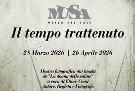 Il Museo del Sale (MUSA) e la Biblioteca comunale “Maria Goia”, in collaborazione con il Gruppo Culturale Civiltà Salinara, annunciano l’inaugurazione - il 28 marzo alle 16.30 - della mostra fotografica “Il tempo trattenuto. Fotografie dai luoghi di La donna delle saline” di Ettore Comi, autore regista e fotografo. Sarà presentato anche il romanzo “La donna delle saline”, l’autore Ettore Comi dialogherà con Beatrice Valeriani, collaboratrice della casa editrice Ponte Vecchio. Fino al 26 aprile.