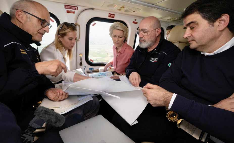 La presidente del Consiglio, Giorgia Meloni, e la presidente della Commissione Europea, Ursula Von der Leyen, in Emilia-Romagna per visionare di persona i territori colpiti duramente dall’alluvione. Insieme al presidente della Regione, Stefano Bonaccini, e al capo dipartimento della Protezione Civile, Fabrizio Curcio, il 25 maggio ha anche sorvolato in elicottero l’intera area colpita. “Vedere queste cicatrici spezza davvero il cuore – ha detto la presidente della Commissione Ue-. Saremo al vostro fianco”. È urgente, ha tra l’altro evidenziato, far partire il Fondo di solidarietà. E poi, per dare il proprio incoraggiamento alla regione, ha detto in dialetto romagnolo: “tin bota’, l’Europa è con voi”.