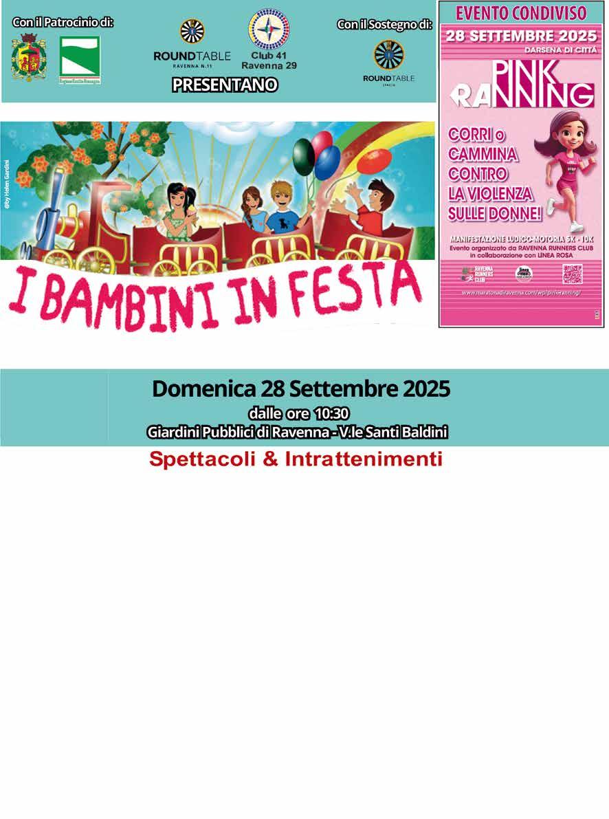 La Round Table 11 ed il Club 41 di Ravenna organizzano il 28 Settembre dalle 10.30 ai Giardini Pubblici di Ravenna (viale Sante Baldini) la 19a edizione di “I Bambini in Festa”, giornata dedicata ai bambini e non solo, con spettacoli, intrattenimenti, dimostrazioni sportive e gastronomia. Il ricavato della giornata sarà devoluto a varie associazioni. Ipresidenti della Round Table 11 Ravenna, Marco Sutera e del Club41 Ravenna, Loris Savini, ringraziano tutti i volontari e gli sponsor.