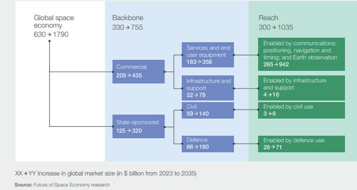 Em 2023, os aplicativos de backbone representaram US$ 330 bilhões, ou pouco mais de 50%, da economia espacial global, enquanto os aplicativos de alcance representaram US$ 300 bilhões. A taxa de crescimento anual esperada para aplicações de backbone e alcance é o dobro da taxa projetada de crescimento do PIB na próxima década. Para efeito de comparação, as estimativas de valor para o espaço são semelhantes às dos semicondutores (estimadas em US$ 600 bilhões, em 2021, com crescimento anual de 6% a 8%, até a década de 2030), e cerca de metade da projeção para a indústria global de pagamentos (estimada em US$ 3,2 trilhões em receitas, até 2027).