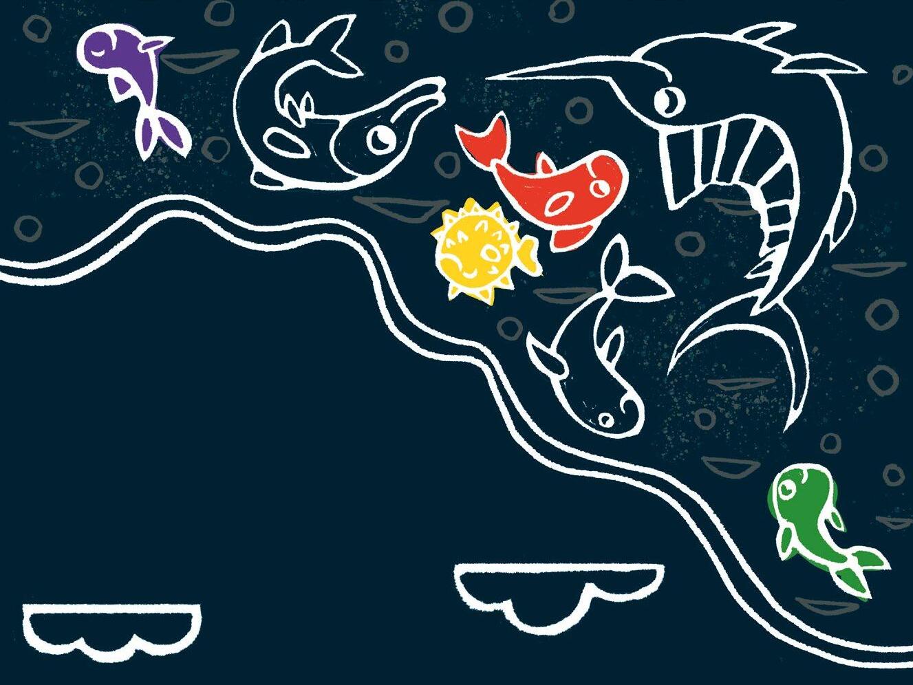 Cantam bolhas, dançam juntos, No baile do alto-mar.