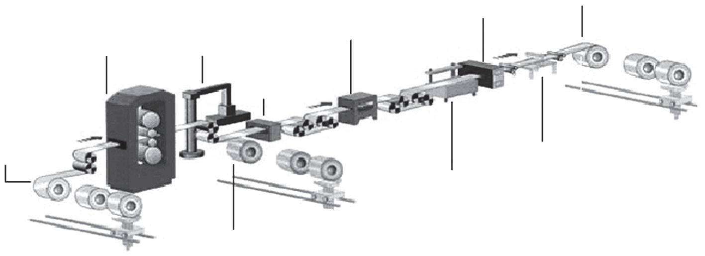 Para a laminação de encruamento, podem ser utilizadas cadeiras duo, quádruo, cadeiras 5hi, 6Hi ou Sendzimir de uma ou duas cadeiras (vide classificação de cadeira de laminação no Capítulo 3 de Rizzo (2007). A regulagem da luz de laminação e, consequentemente, da carga de laminação pode ser feita por parafusos mecânicos ou por cápsulas hidráulicas (sistema mais recente). Rolos tensores podem ser utilizados para aumentar a correção de planicidade da chapa. A etapa de laminação de encruamento pode ser realizada na instalação de recozimento contínuo, após todo o processo no recozimento, ou seja, antes de a bobina ser rebobinada, ou pode ser efetuada em uma instalação em separado, exigindo desbobinamento, realização da laminação e novo bobinamento. Na Figura 7.1, é mostrada uma representação esquemática de uma unidade de laminação de encruamento de chapas e folhas independente de uma linha de recozimento contínuo. Uma unidade inserida na linha de recozimento contínuo foi apresentada na Figura 6.9.
