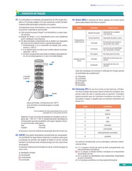desses elementos, produzindo as mudanças observadas no mundo Os quatro “elementos-princípios” de Empédocles foram adotados pelo importante filósofo grego Aristóteles (384-322 a C ), que lhes atribuiu qualidades Assim, segundo Aristóteles, apenas quatro das seis combinações possíveis seriam permitidas: Quente e seco combinavam-se para formar o fogo Quente e úmido combinavam-se para formar o ar Frio e seco combinavam-se para formar a terra Frio e úmido combinavam-se para formar a água SAIBA MAIS ASSuNTOS ABORDADOS W Estados físicos da matéria n Transformações físicas n Gráficos de mudanças de estado Química O desenvolvimento tecnológico trouxe grandes benefícios ao ser humano, dentre eles, o tratamento de águas para o abastecimento público� O uso de água de boa qualidade reduziu de maneira intensa um grande número de doenças, como a cólera e o tifo, que já representaram grandes ameaças para a sociedade� As principais operações realizadas nas ETAs são: a floculação ou coagulação (3) a decantação (4) a filtração (5) e a desinfecção (6) Essas operações podem variar dependendo da fonte de água e dos padrões a serem alcançados� Represa 1 Bombeamento Sulfato de Alumínio Cal Clor 3 4 5 6 Floculação Decantação Filtração Cal Clor Flúor Carvão Areia Cascalho Reservatório Água Final (ETA) 5 2 8 Reservatório dos Bairros Distribuição 9 O principal objetivo dessas operações é atingir o estado de potabilidade exigido para o uso da água� A remoção de materiais particulados, de bactérias, de algas e de vírus é essencial para o bom uso desse recurso� Inicialmente, podemos remover o material de grandes dimensões por filtração, por meio de grades de separação� Por decantação direta (sem a adição de substâncias químicas) seguida de filtração, retiramos as partículas de tamanhos menores. Quando as partículas não decantam naturalmente, é acrescentado um produto químico que acelera a coagulação ou floculação dessas partículas, que podem ser retiradas por decantação ou por meio de filtros adequados. Os agentes químicos mais utilizados são os sulfato de alumínio – A (SO – sais de ferro III e até polímeros orgânicos� Tratamento químico da água A química do processo de floculação ou coagulação pode ser representada de maneira simplificada pela seguinte equação: A (SO (s) + 6 H O( → 2 A(OH) (s) + 3 H SO (aq) Quando se coloca o sulfato de alumínio em água, há dissociação com liberação de íons A e SO4 Os íons alumínio sofrem hidrólise e produzem o hidróxido de alumínio (A(OH) ), que interage com partículas em solução produzindo um sistema coloidal de diâmetro médio maior� Isso possibilita a decantação� Normalmente essa operação não é suficiente para tornar a água totalmente clara. Outro processo a ser realizado é a filtração O mecanismo de filtração consiste na retenção de partículas com diâmetro maior que os poros do filtro. Mas, para assegurar que a água esteja realmente livre de organismos patogênicos, devemos fazer a desinfecção� O processo de desinfecção comumente utilizado é a cloração� O uso de hipoclorito de sódio (NaCO) ou até mesmo de cloro gasoso (C tem por objetivo destruir ou inativar os micro-organismos� Alguns outros princípios de desinfecção são a utilização de ozônio luz ultravioleta dióxido de cloro ou cloraminas Mas o cloro continua sendo o método relativamente mais empregado devido à relação custo/benefício� O cloro é uma substância de alta reatividade e quando adicionado à água produz oxidação de substâncias orgânicas e inorgânicas� Esse cloro é chamado de cloro ativo livre� Para melhor entendimento das etapas de tratamento da água, assista à animação do processo de tratamento disponível em: http://objetoseducacionais2. mec.gov.br/bitstream/handle/ mec/5035/index.html?sequence=8 SAIBA MAIS 35