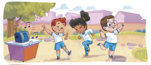 3. Incentive os grupos a ter autonomia e a usar a criatividade para escolher uma música e criar uma coreografia para caracterizar personagens e expressar os elementos mais importantes da história, com movimentos ritmados, giros e saltos, se quiserem. Explique que eles devem agir de forma colaborativa e com empatia, relacionando-se de maneira respeitosa. Essa é uma boa oportunidade de conversar com os estudantes e facilitar a compreensão de que todos os corpos podem e devem participar das práticas corporais, independentemente da habilidade, do biotipo ou de qualquer outro fator que evidencie alguma diferença.