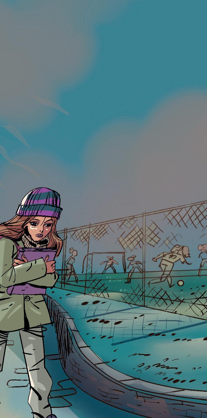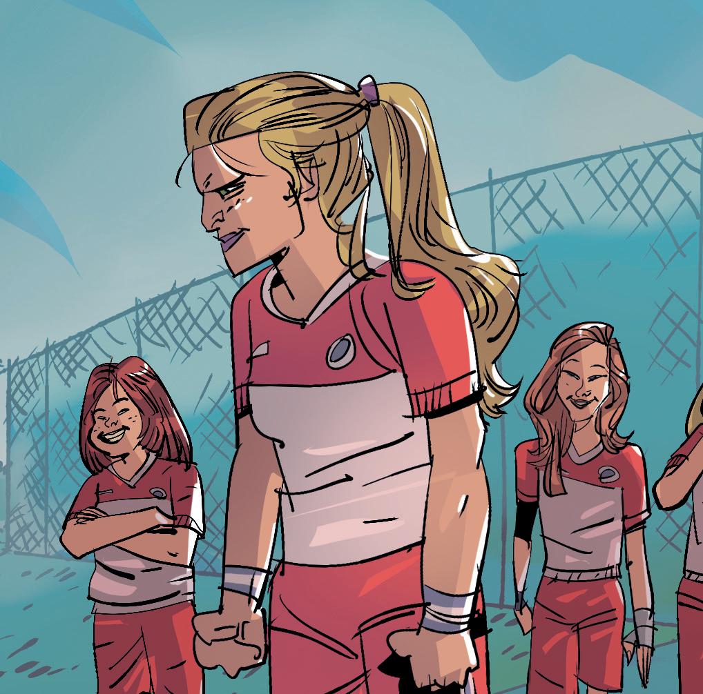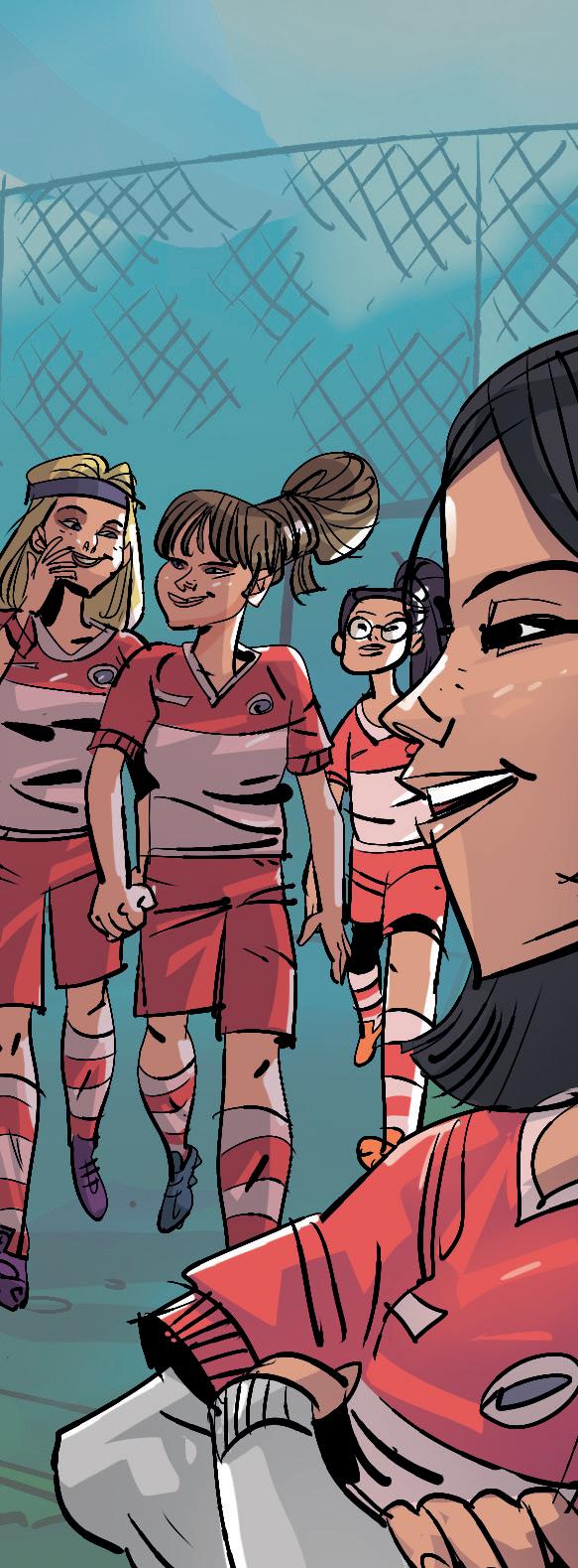 There are some girls playing soccer on the field. It’s Sam Brown and her friends.
