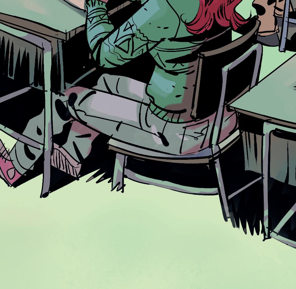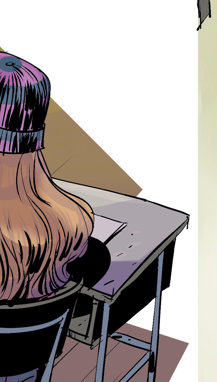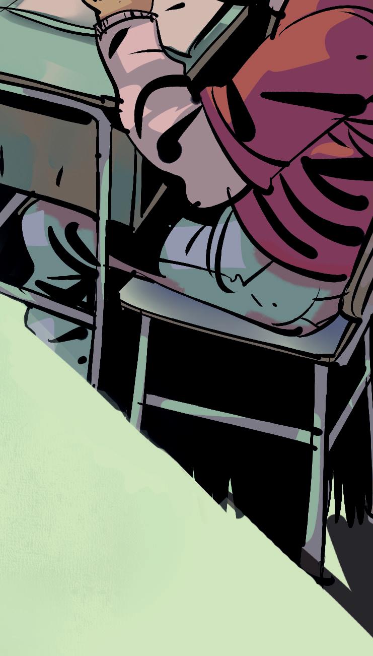 Aisha sits down at the front of the class. She looks nervous and afraid.