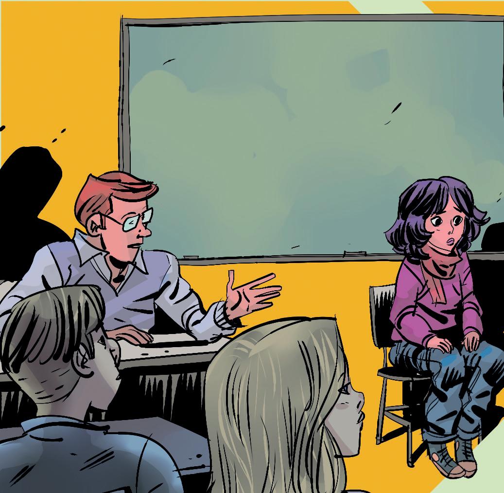 “Don’t worry,” says Mr. Bale. “Sit down here. Maybe the class can ask you some questions… to get to know you?”