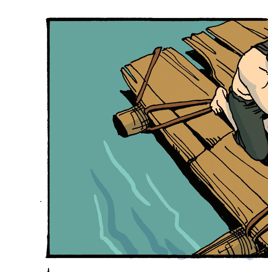 Then I began to go back to the shore. The ship’s dog swam with me. The raft moved very easily because the tide was going toward the shore. It took me to the mouth of a little river.
