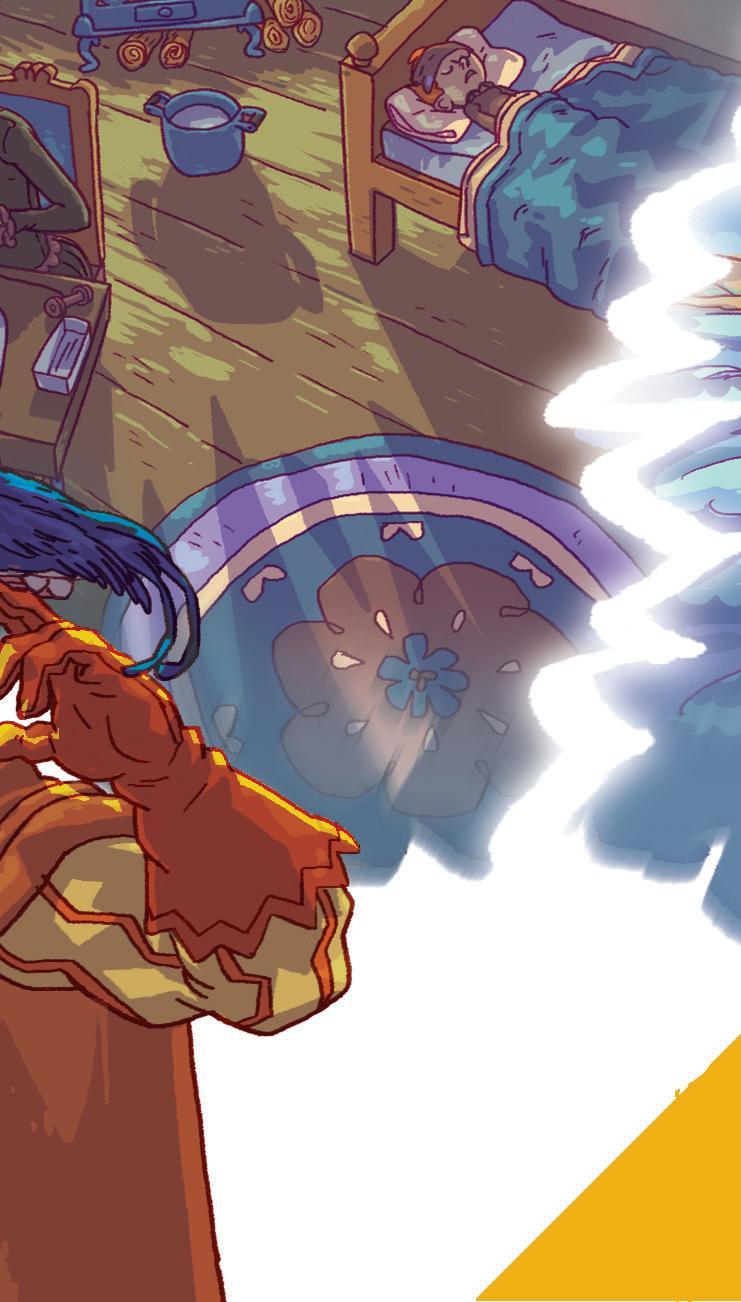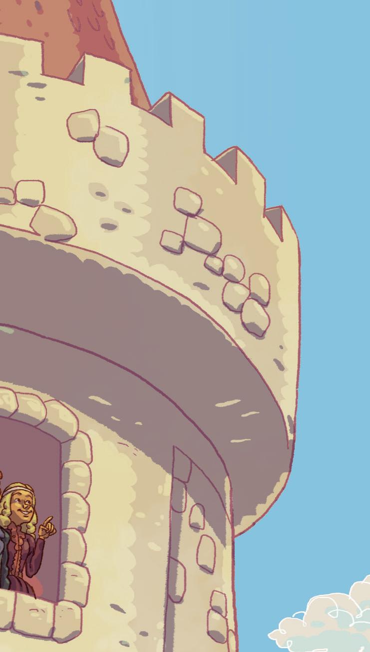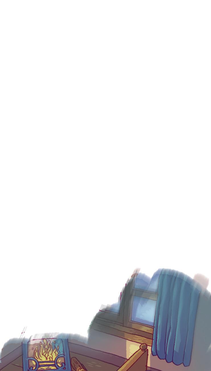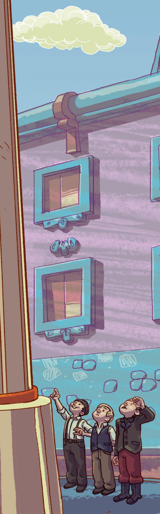 The swallow takes the red jewel from the sword and flies over the city. He flies past the queen’s palace. There are people dancing in there, and he can hear the loud music. A young woman and a young man are looking over the cold city from an open window.