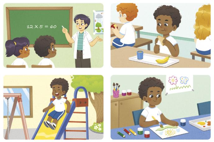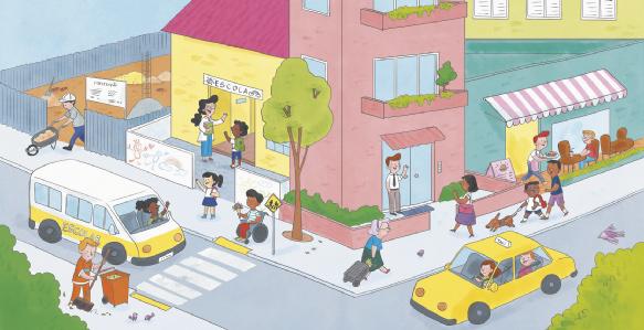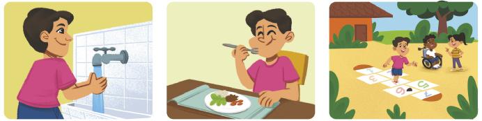 realizadas de diversas formas, pensando-se naquela que melhor se adequa à turma. Na atividade 3 é possível elaborar uma lista na lousa com as semelhanças e diferenças levantadas pelos estudantes para cada uma das fotografias. Depois, eles podem escolher uma delas e registrar no caderno. Na atividade 4 os estudantes deverão escrever as principais características da escola onde estudam. Ajude-os a realizar a atividade; para isso, faça um levantamento coletivo das características da escola registre-as