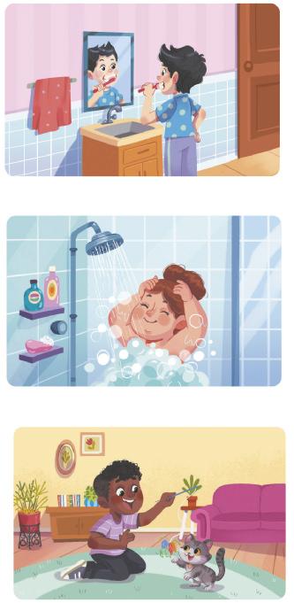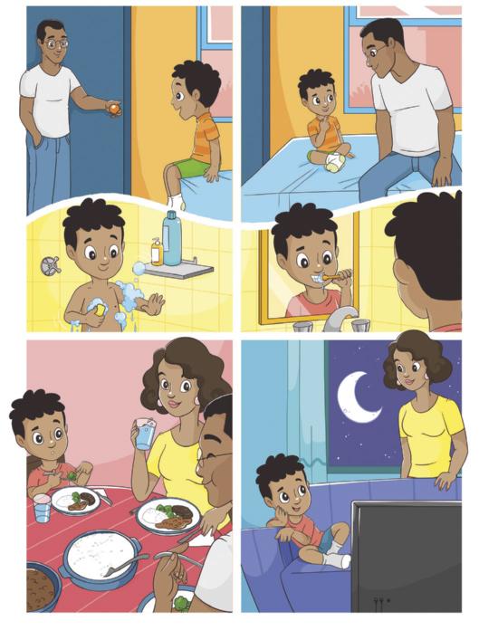 e comunidade. BNCC HABILIDADES (EF01CI05) Identificar e nomear diferentes escalas de tempo: os períodos diários (manhã, tarde, noite) e a sucessão de dias, semanas, mee anos. (EF01HI01) Identificar aspectos do seu crescimento por meio do registro das lembranças particulares ou de lembranças dos membros de sua família e/ou de sua comunidade. (EF01HI02) Identificar a relação entre as suas histórias e as histórias de sua família e de sua comunidade. (EF01HI03) Descrever e distinguir seus papéis e responsabilidades relacionados à família, à escola e à comunidade. (EF01HI06) Conhecer as histórias da família e da escola e identificar o papel desempenhado por diferentes sujeitos em diferentes espaços. (EF01GE01) Descrever características observadas de seus lugares de vivência (moradia, escola etc.) e identificar semelhanças e diferenças entre esses lugares. (EF01GE08) Criar mapas mentais e desenhos com base em itinerários, contos literários, histórias inventadas e brincadeiras. TEMAS CONTEMPORÂNEOS TRANSVERSAIS (TCTs) • Direitos da criança e do adolescente. ENCAMINHAMENTO Antes de iniciar a atividade 1 oriente os estudantes a observar atentamente as imagens, identificando as ações e brincadeiras que aparecem. Incentive-os