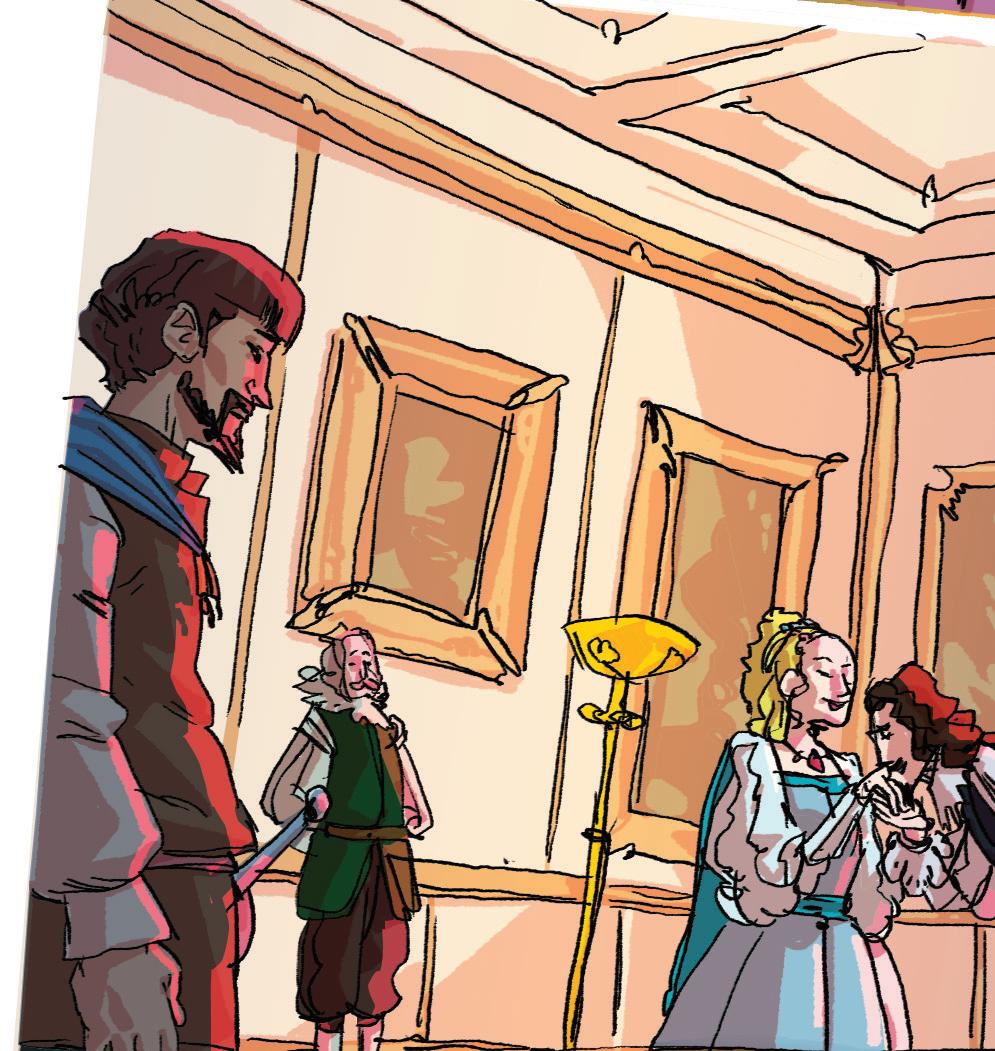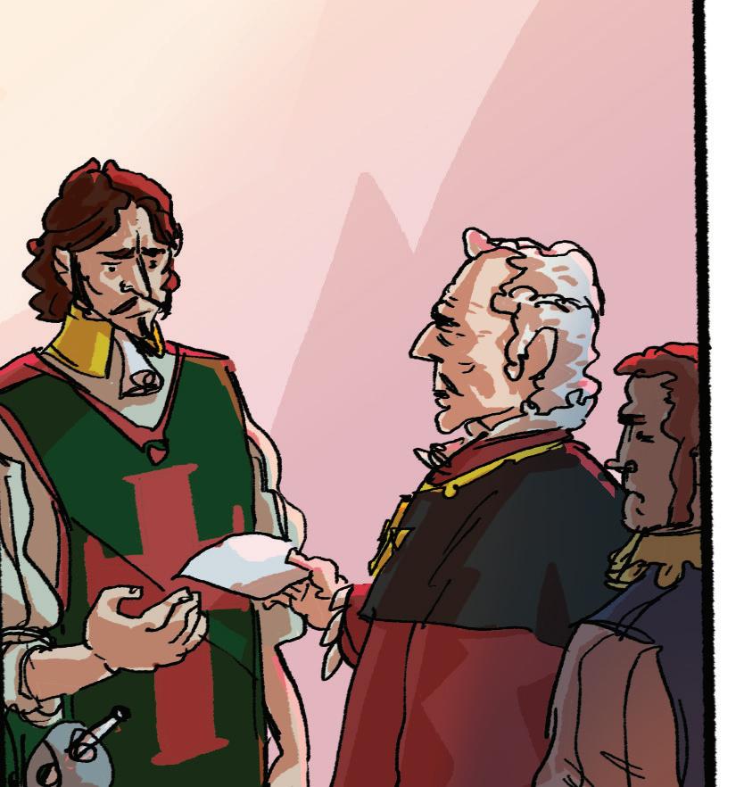 Next d’Artagnan saw a handkerchief on the road. It was near Aramis, a tall musketeer, so d’Artagnan gave him the handkerchief.