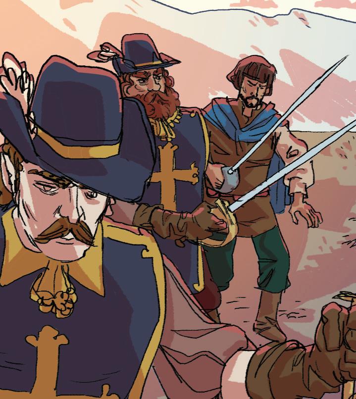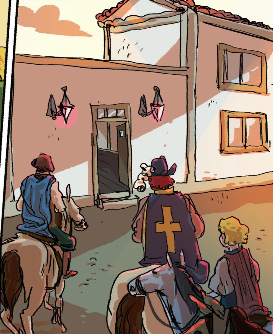 They rode all morning until they came to an inn. There, Porthos met a man and they started ghting. The man worked for Cardinal Richelieu, but Porthos did not know that.