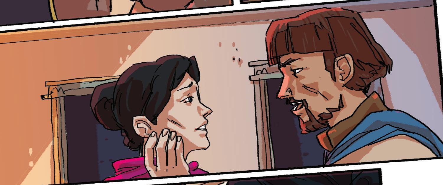 D’Artagnan followed Constance Bonacieux and the Duke of Buckingham to the palace. Then the Queen came into the room and Buckingham took her hand.