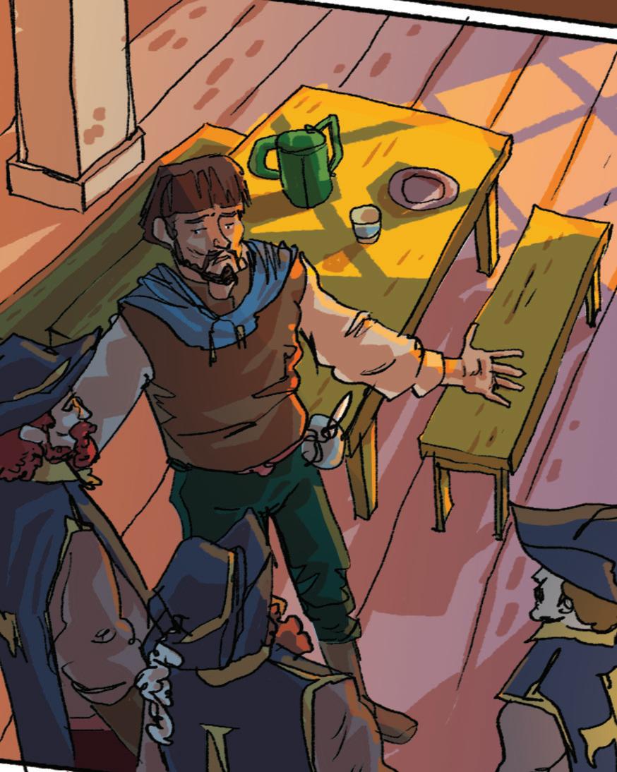 That evening, they arrived at another inn. They ate dinner and drank wine. But the man at the inn did not take Athos’ money and they began to fight.