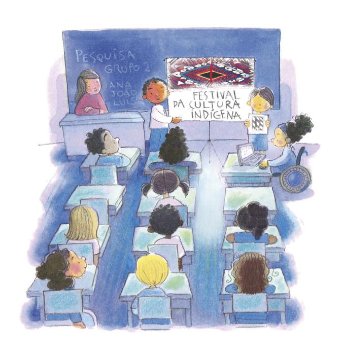 ATIVIDADES Professor planejar, junto com os estudantes, a produção de um telejornal para o público infantil, apresentando informações sobre festas que acontecem na região onde os estudantes vivem. Pedir a eles que partilhem seus conhecimentos sobre telejornais e sobre a forma de organização desse meio de comunicação. Orientar os estudantes a partilhar as tarefas e a coleta de materiais para o jornal (entrevistas em áudio e vídeo, vídeos e fotografias com imagens das festas, depoimentos de adultos e crianças que já participaram da festa, cartazes de divulgação). Auxiliar os estudantes na produção/gravação do telejornal e na inserção dos materiais obtidos. Finalizado, o material pode ser apresentado aos estudantes de outras turmas; em eventos do colégio; em reunião de pais ou responsáveis. A coleta de dados sobre festas possibilita o desenvolvimento da seguinte 54 11/10/25 13:24