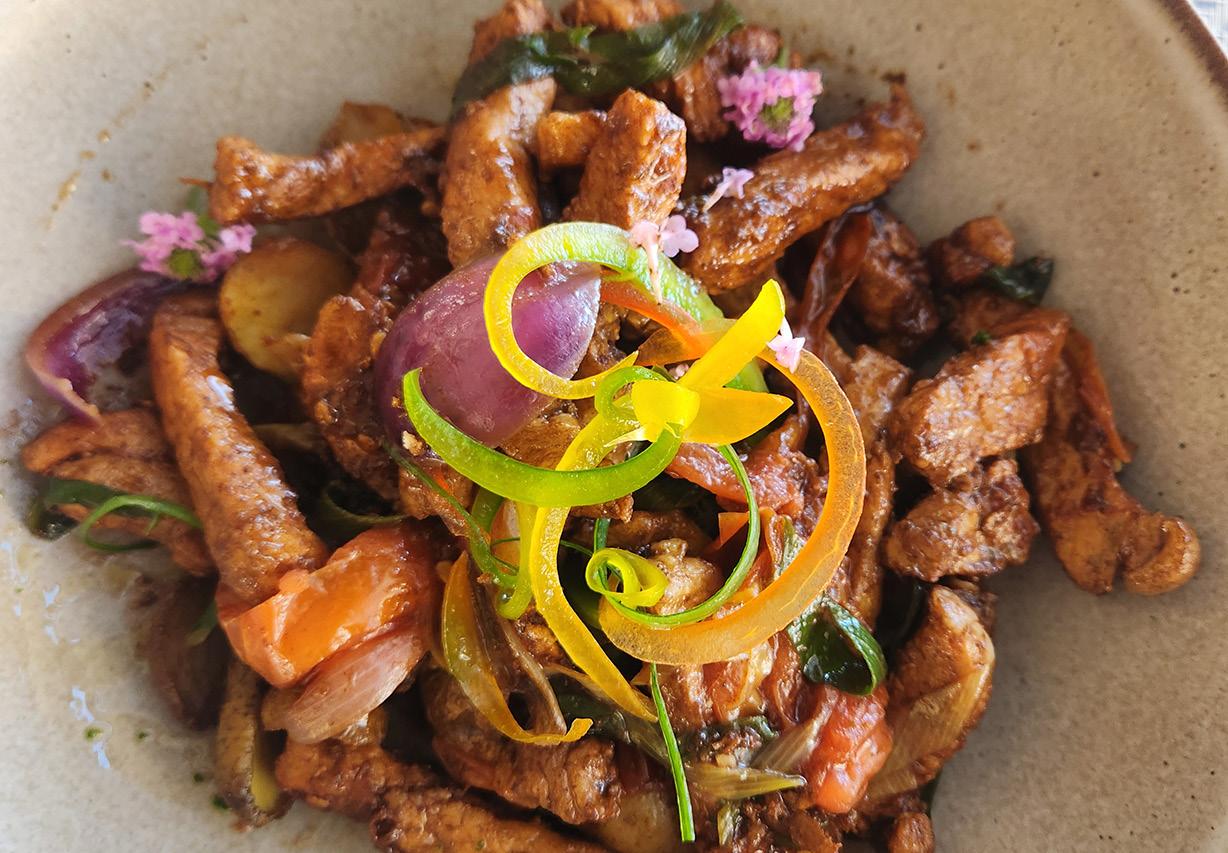 para celebrar a chegada do verão, o Txai Resort itacaré apresenta seu novo menu Praia. O cardápio traz criações que valorizam ingredientes locais, técnicas apuradas e inspirações da culinária baiana e contemporânea. O verão foi a inspiração para a criação de pratos leves, versões para compartilhar e receitas que dialogam com o clima ensolarado da Bahia. O novo menu traz pratos como o Crocante de mandioca com carne seca e o Homus de beterraba com peixe branco confitado. Entre os pratos principais destacamse favoritos como o Peixe inteiro na brasa, servido com farofa de banana, arroz com brócolis e legumes e o Camarão da Terra, um clássico do Txai, acompanhado de purê de banana-da-terra, cuscuz e molho de laranja com gengibre. O menu revela ainda pratos executados com simplicidade e técnica, valorizando ingredientes típicos da região como o Filé com arroz acebolado, servido com banana frita e espinafre da Camboinha. Para aqueles que buscam opções mais leves para combinar com os dias de verão, uma boa pedida é o Pad thai baiano, com macarrão de arroz, manga, castanha de caju e camarão. mais informações: txairesorts.com