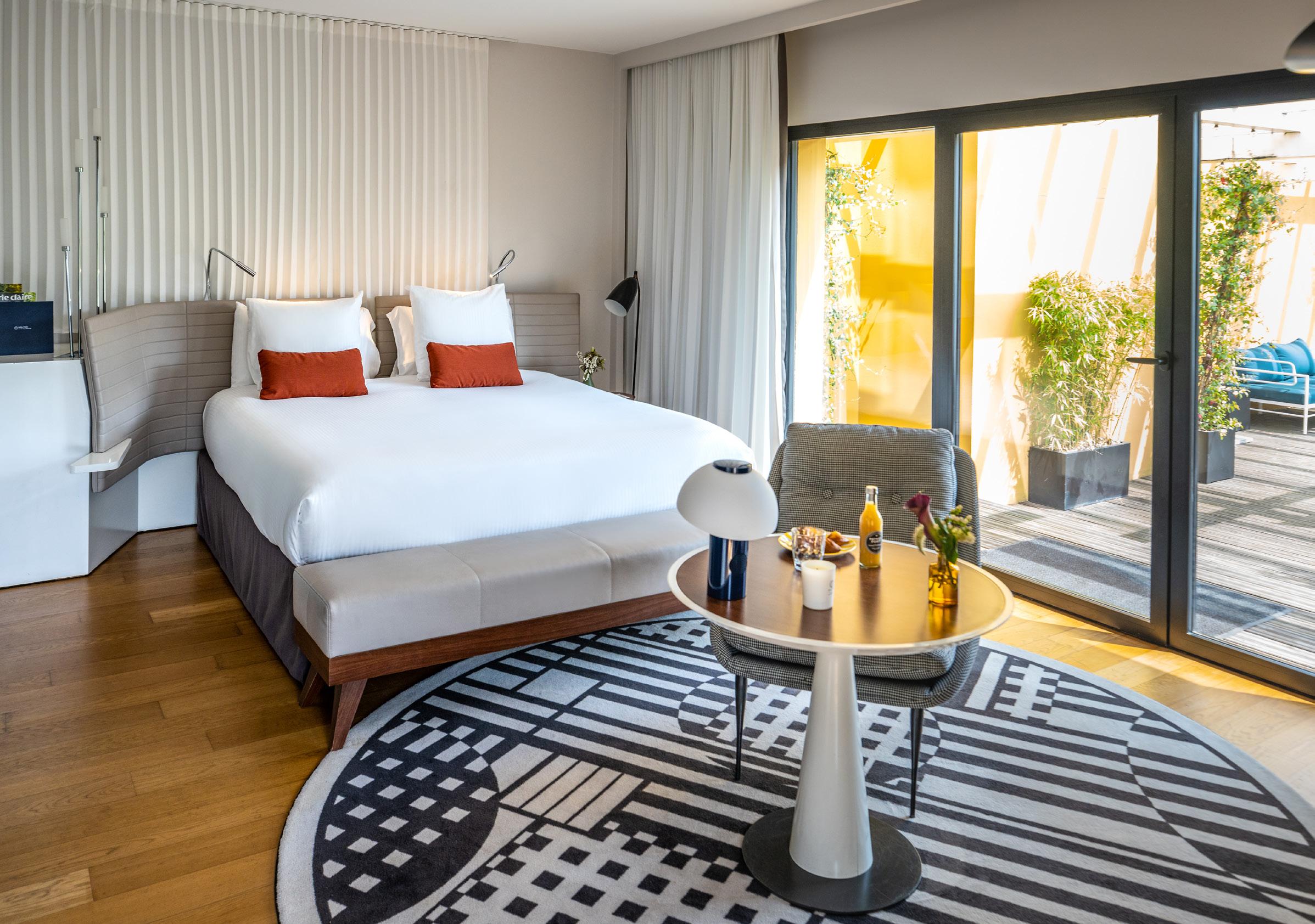 A atmosfera dos quartos, criada por Jean-Philippe Nuel, segue um estilo minimalista sofisticado, onde cada detalhe foi pensado para trazer serenidade. Os tons de creme, areia e carvão criam um ambiente que abraça. as linhas são limpas, o mo-