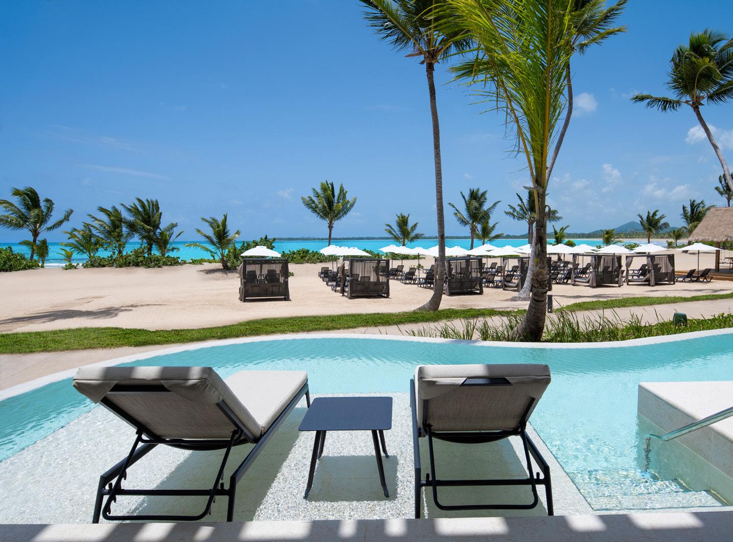 Na ala Preferred Club, há suítes com piscina privativa de frente para a praia